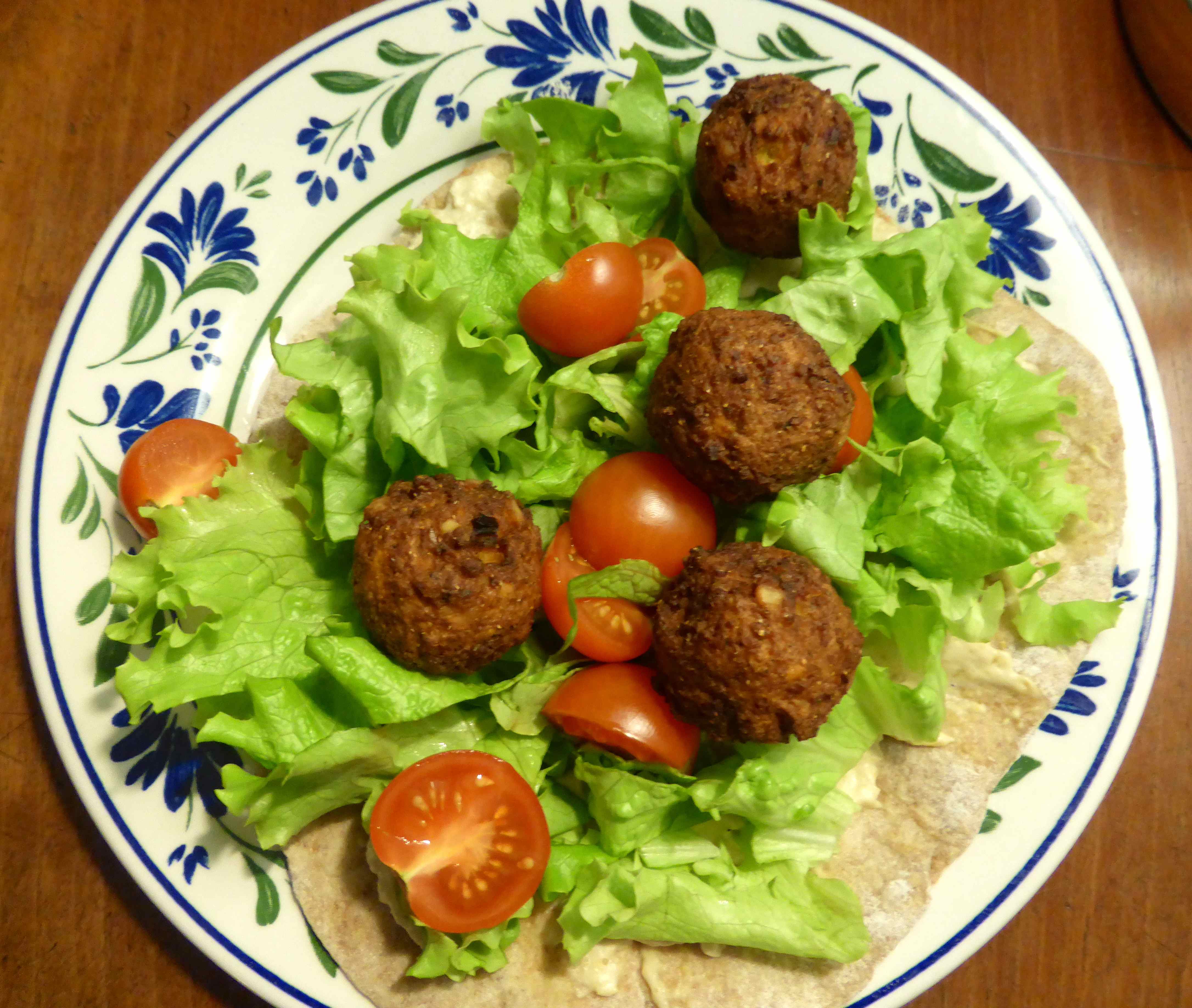 I am going to make another batch of that dough this weekend and freeze it in to individual portions as this was such a quick and easy supper to make after a long day at work. It took about 15 minutes from me thinking about it to sitting down and eating it. While the falafels heated through in the oven and the wrap was cooking I had time to unload the dishwasher and some other errands. There is very little to wash up either so I am definitely making these again.