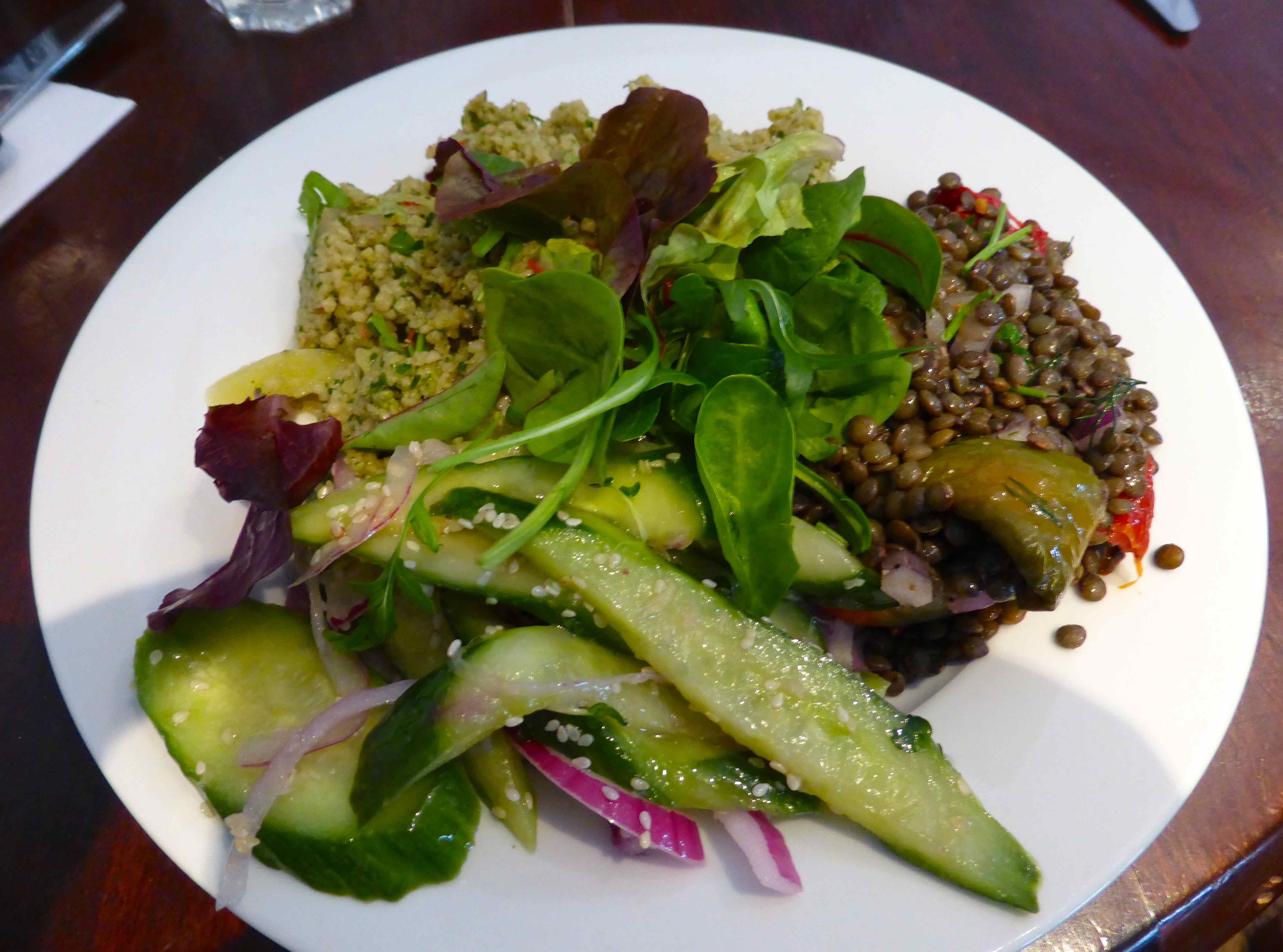 They were very good at looking up the ingredients of their salads and they confirmed these three were all vegan: couscous with lots of finely chopped herbs, lentils with roasted veggies and a cucumber salad. It was excellent.