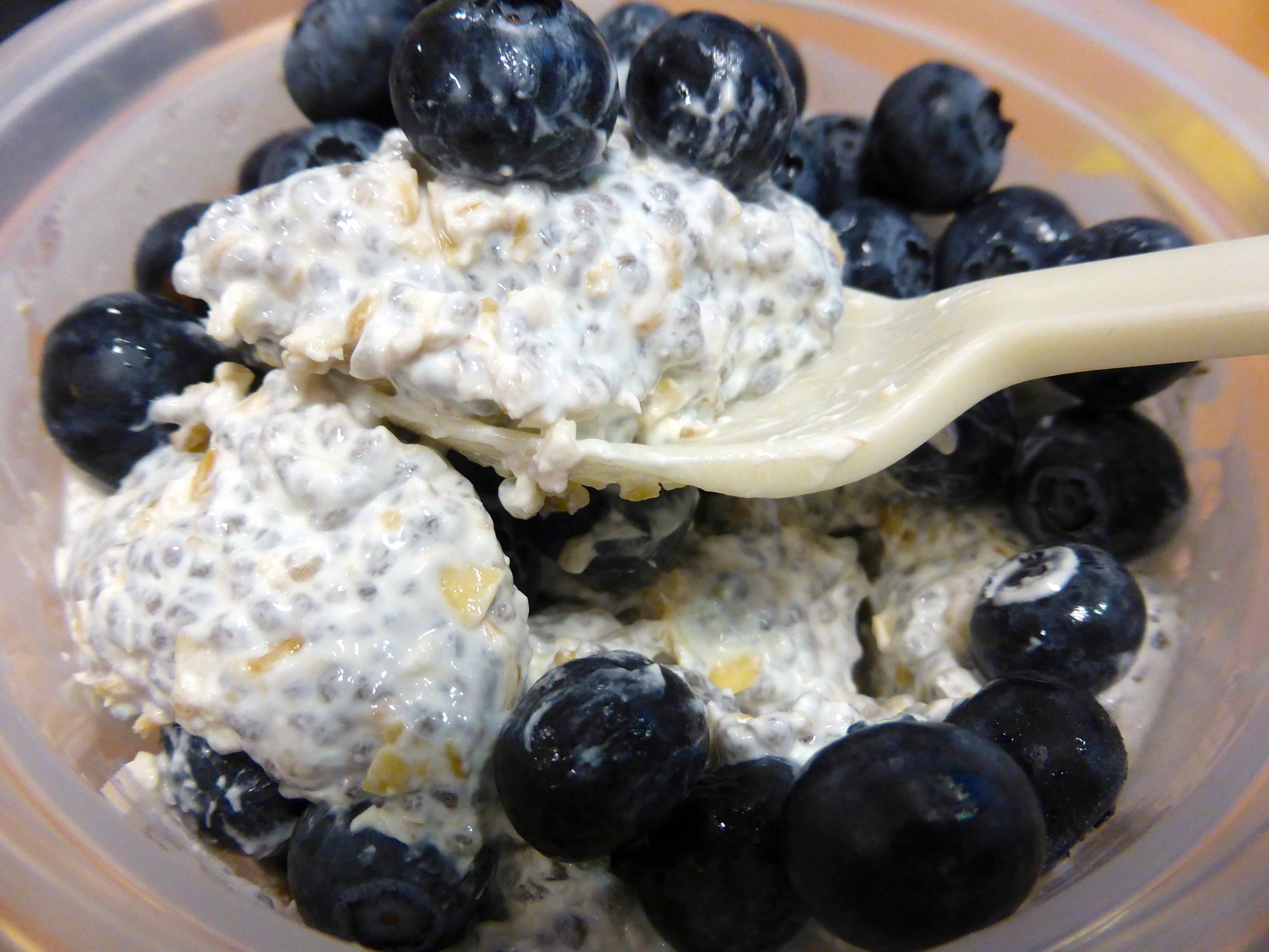 Chia seeds and raw oats soaked overnight in almond milk and coconut yogurt with blueberries and a banana.