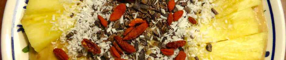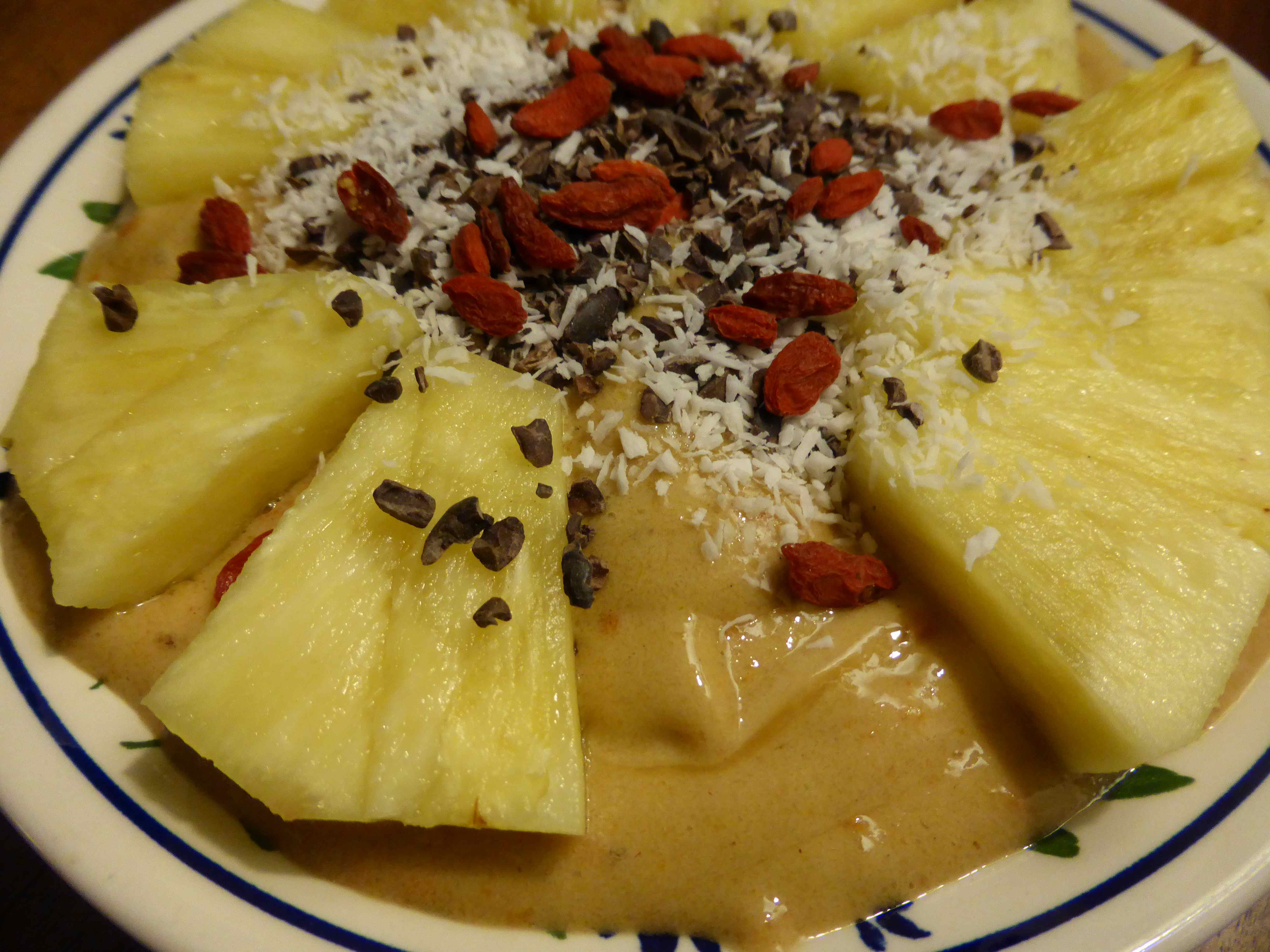 I blended up 2 persimmons with 2 frozen bananas and topped it with some cacao nibs, coconut, Goji berries and pineapple.