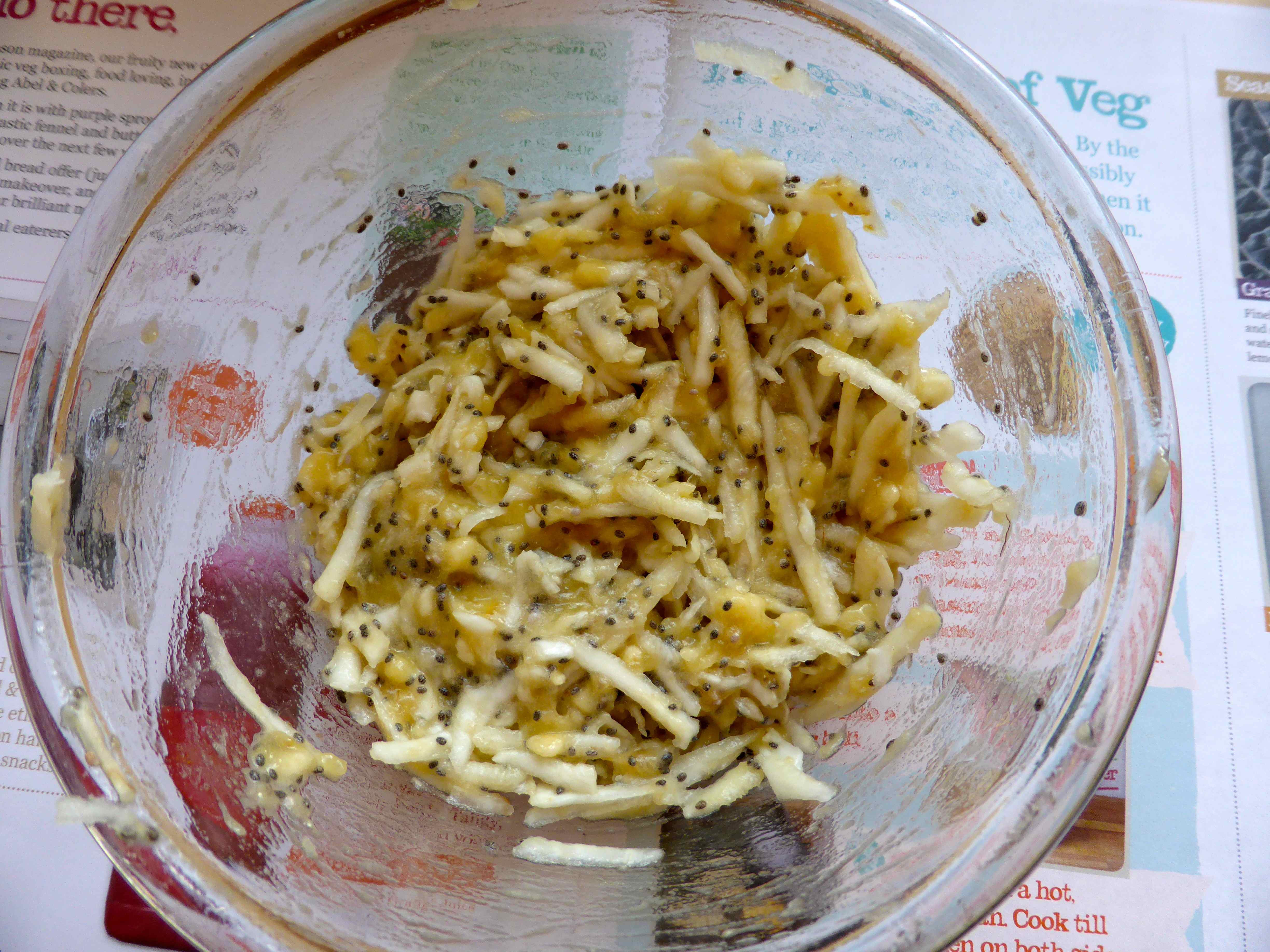 As mine were sweet rostis I didn’t add the garlic, herbs, salt or pepper. I just stirred in the grated celeriac.