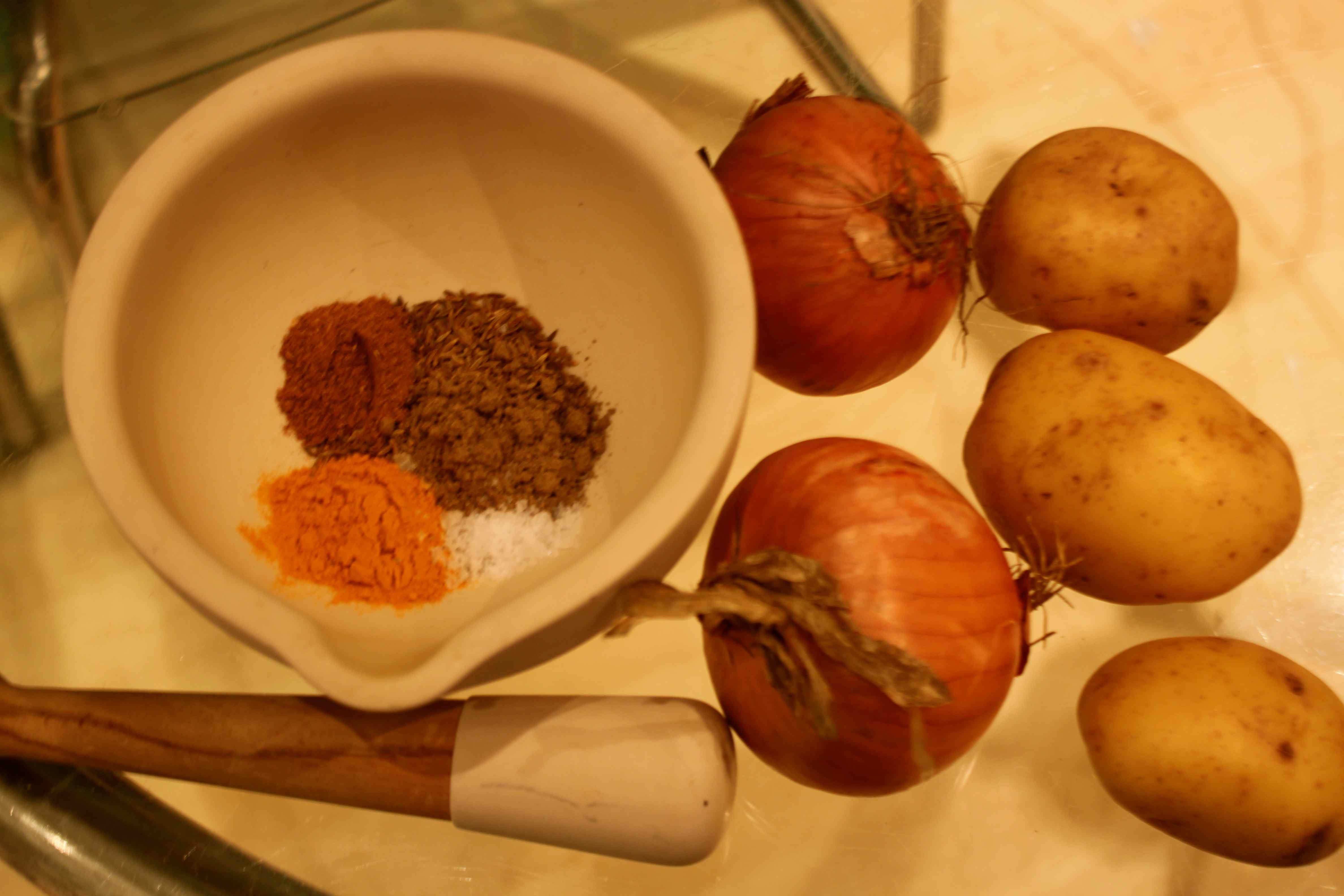 1. mix together the gram flour, cumin, coriander, turmeric, salt and mixed spice (I gorund mine up so there were no “bits” in it i.e. the cumin seeds
