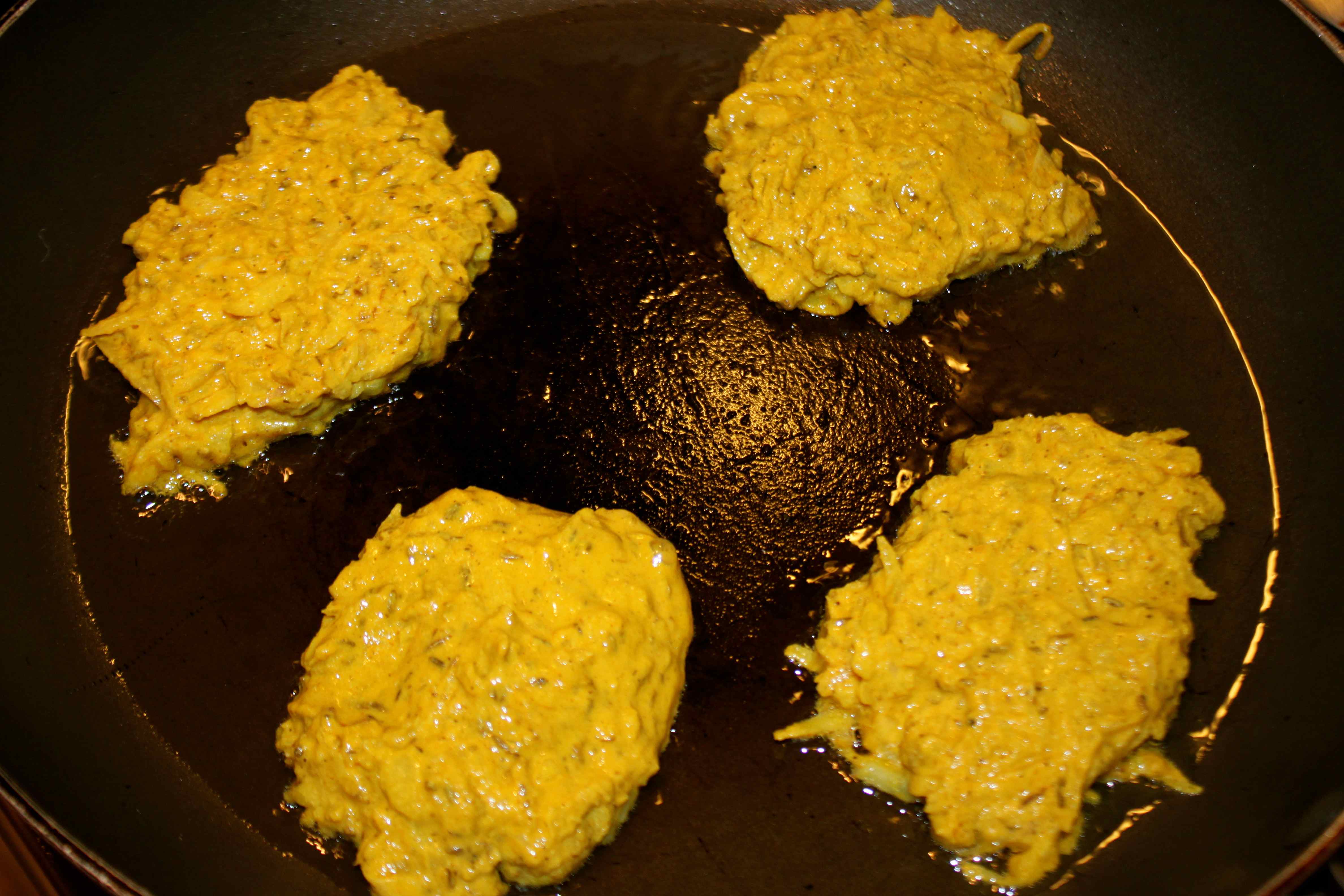 4. Heat the oil and drop in 4 (you could make them smaller if you want) spoonfuls of mixture