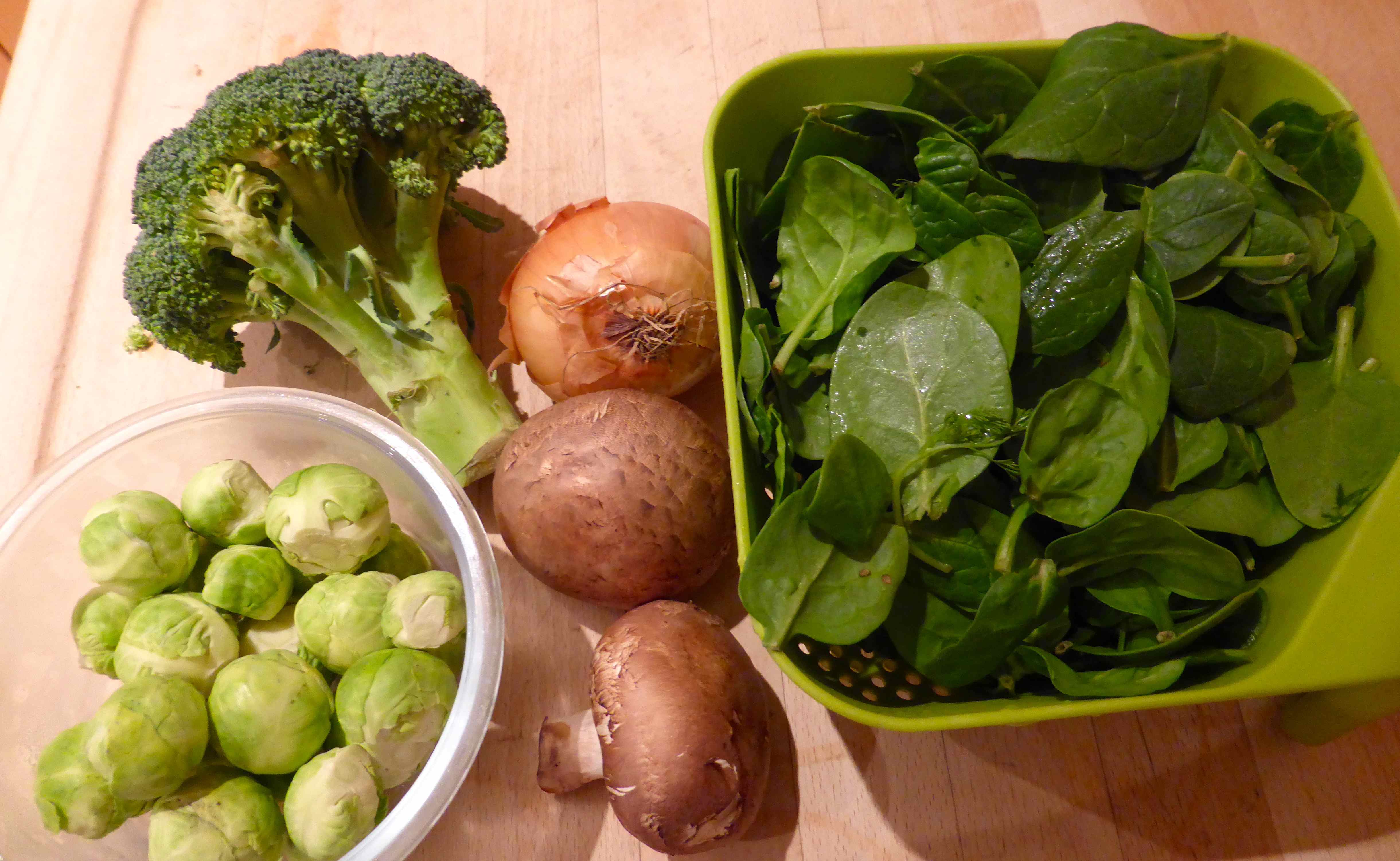 Half a bag of spinach, a small head of cauliflower, 2 large chestnut mushrooms, one brown onion and lots of brussel sprouts.