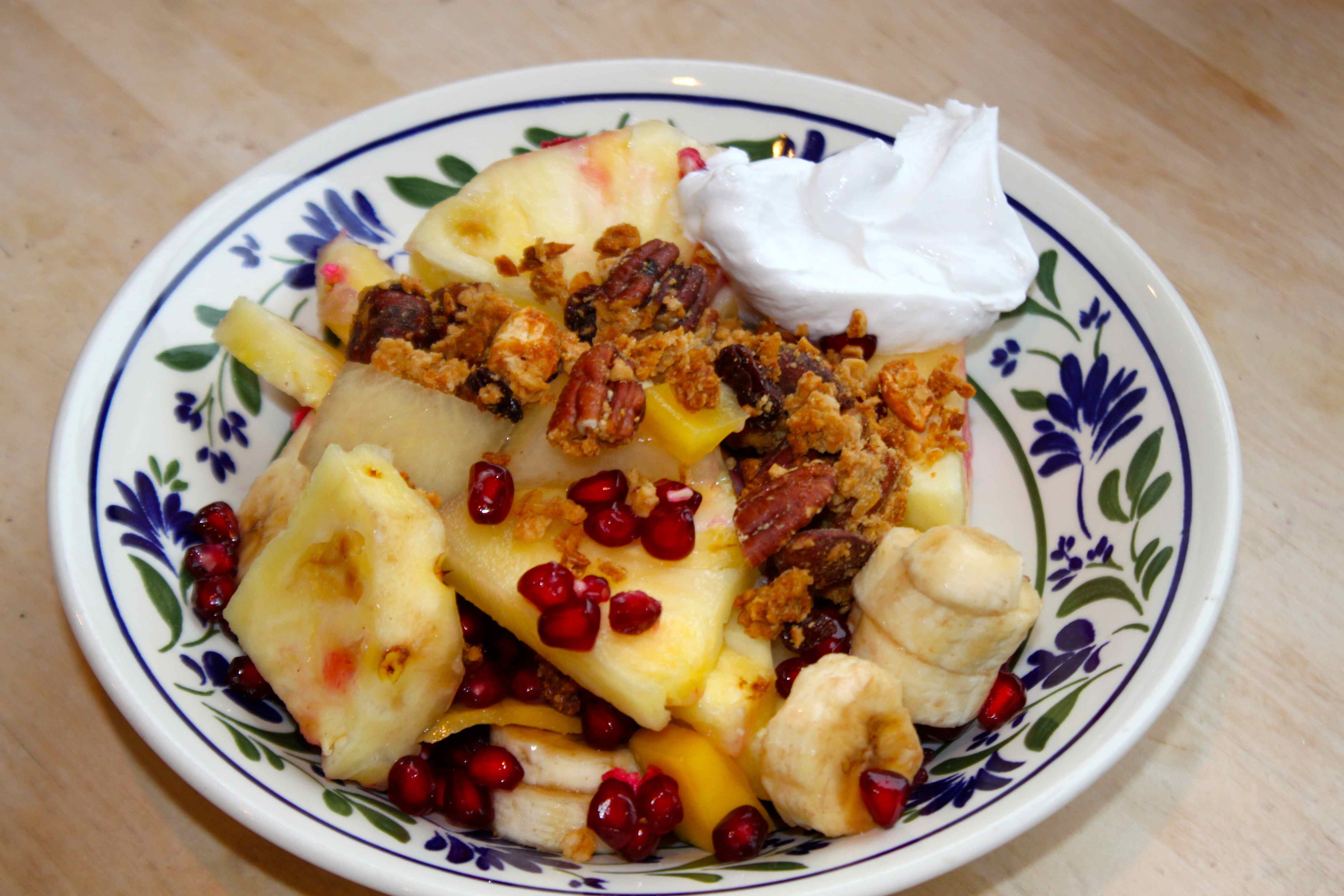 A delicious bowl of fruit salad made with pineapple, banana, mango, melon and pomegranate, topped with a little of the homemade granola and some coconut yogurt. 391 calories.