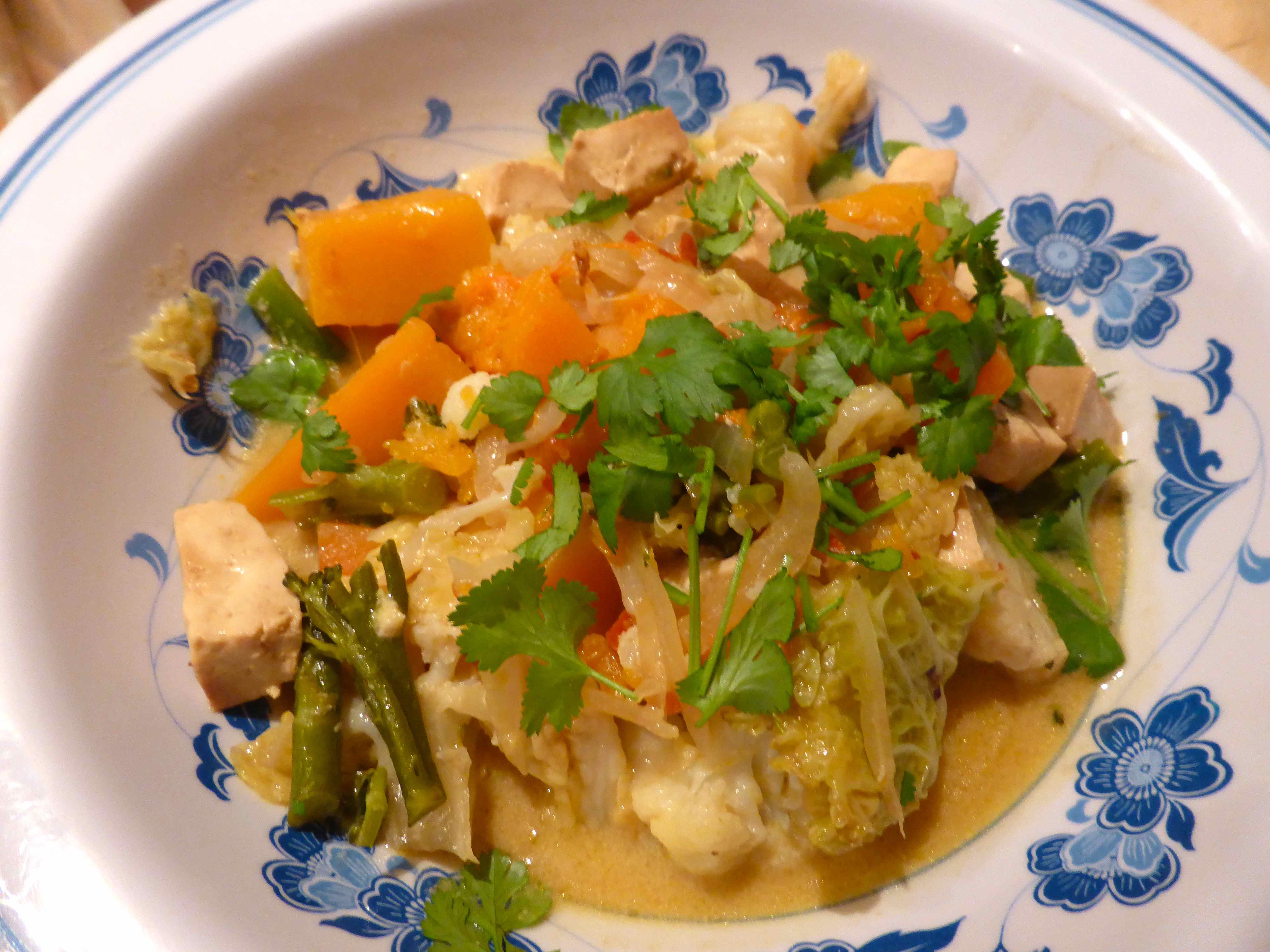 Supper was ….. more vegetables! Lara helped me cook a vegetable laksa with tofu. We ate it as it was, with no noodles or rice. 440 calories.