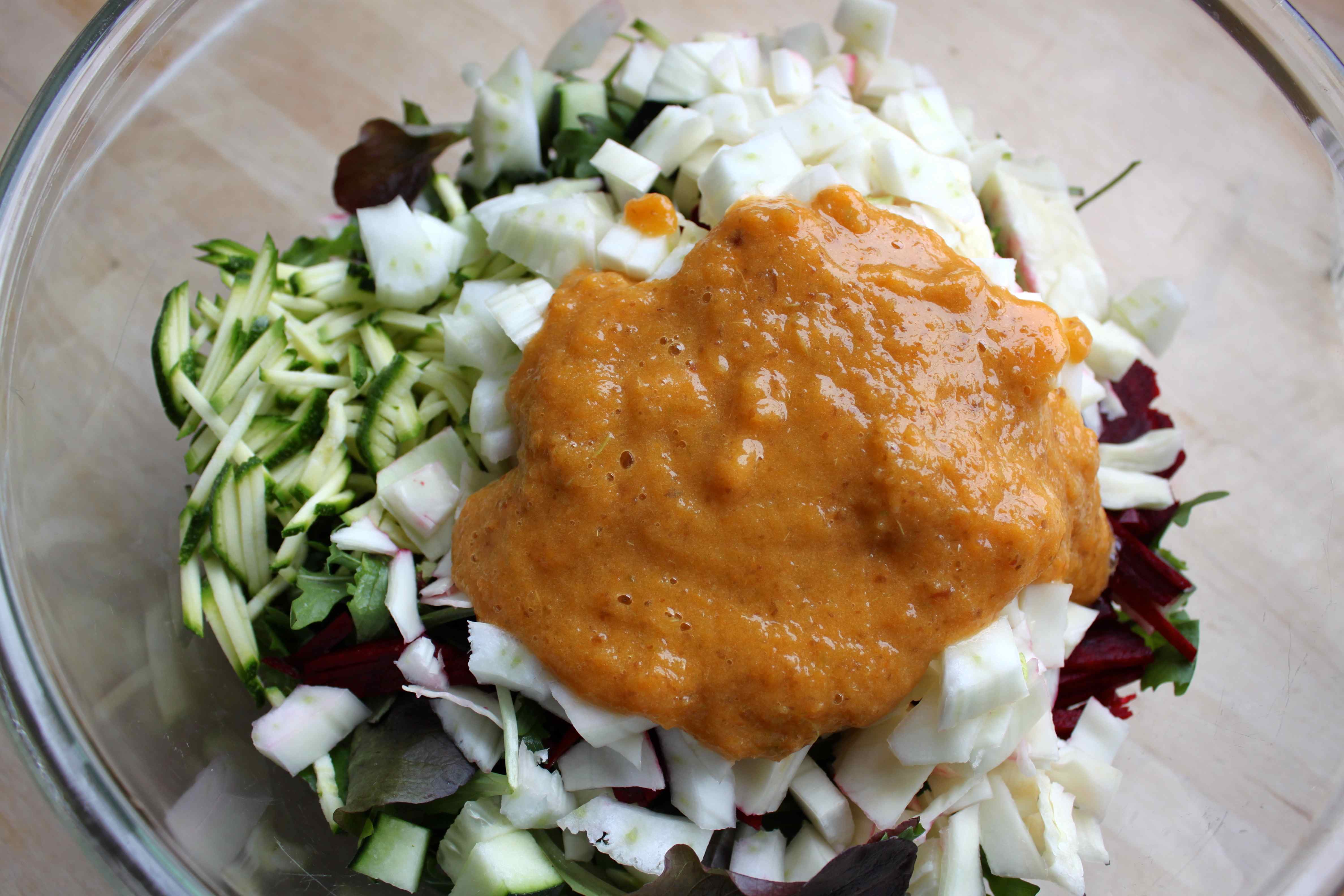 I made a smoothie with a star fruit, blueberries, 2 kiwis, 3 frozen bananas and a tsp of spirulina.smoothie ingredients 1 I have decided I don’t like star fruit.  This one was crisp like an apple but slightly sour with nothing pleasant about the flavour, so I put the whole thing in to a smoothie.star fruit in 3 bits Grey is not the best colour for a smoothie (I blame the blueberries and spirulina) but it tasted great and the cold smooth consistency was perfect for a sore throat.spirulina banana smoothie I have been reading about some oil and vinegar free salad dressings where the main ingredients are celery, which is salty, and juicey fruits.  I made a delicious dressing with 1 celery stalk, 3 clementines and 2 dates.  You put everything in a blender and blitz until smooth.clementine dressing For the salad I had a pile of mixed green leaves,mixed greens some mandolined courgette and beetroot, mandolin courgettes Finely chopped white cabbage and fennel,cabbage and fennel Tossed in the fruity dressing.fruit dressing 3 Garnished with cherry tomatoes and black pepper.fruit dressing 2 It made a huge bowlful and it was very tasty.fruit dressing 1 For breakfast today I was craving a citrus smoothie so I put all these clementines in the Vita Mix with one frozen banana and blitzed until it was all smooth.clementines for smoothie A glass of sunshine on this overcast day.clementines and banana smoothie It tasted amazing and I will definitely be making this again.clementine and banana Since I am feeling better, I managed to walk again this weekend.  Yesterday Annette showed us a route from our house up to Bumbles plant nursery.  I bought some seeds there and felt my ‘green’ credentials were given a boost as I walked to buy my seeds rather than drive and will use them to grow some food in my garden.