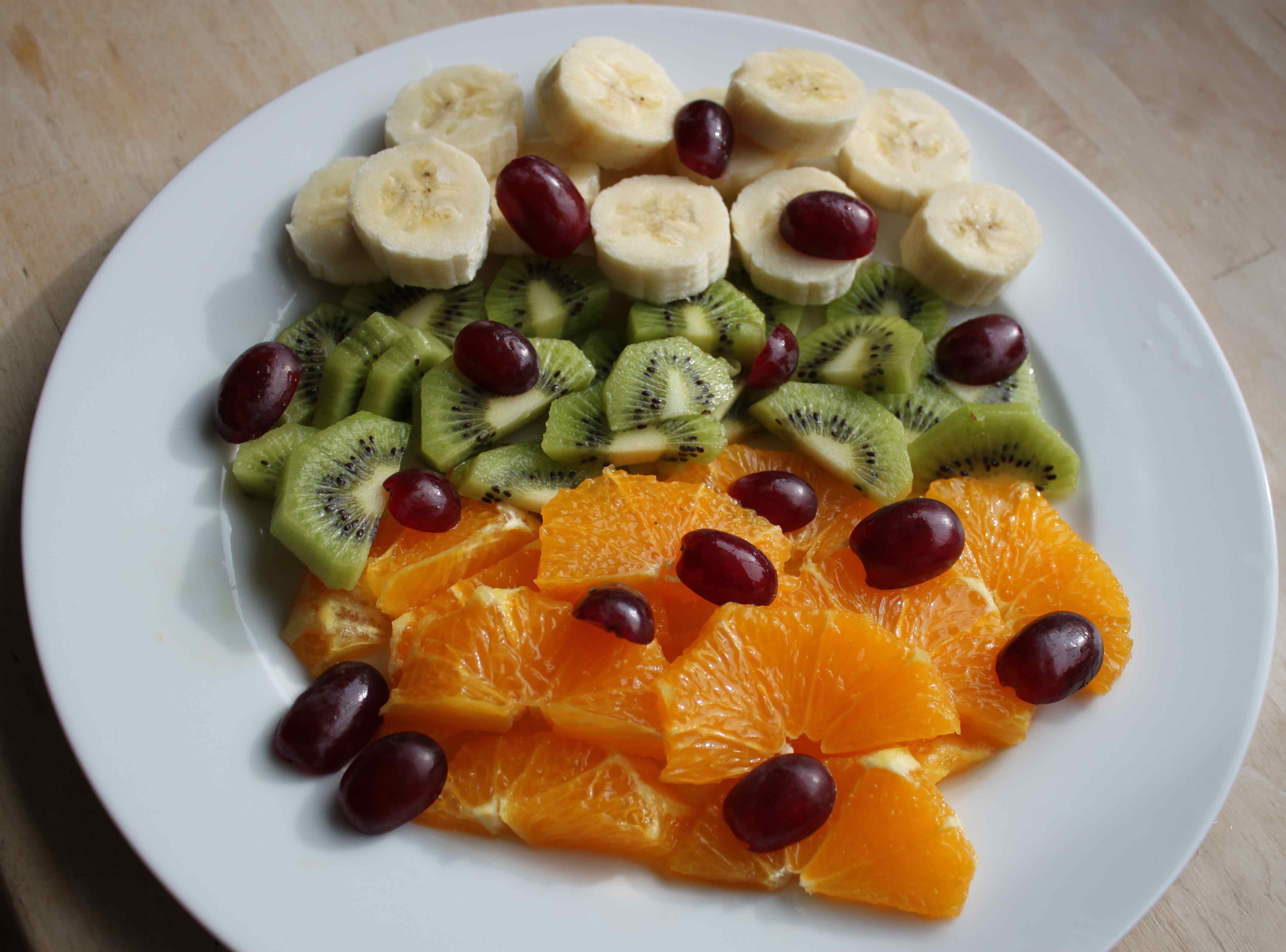 A simple fruit salad for breakfast made with a banana, 2 kiwis, 1 large orange and some black grapes.