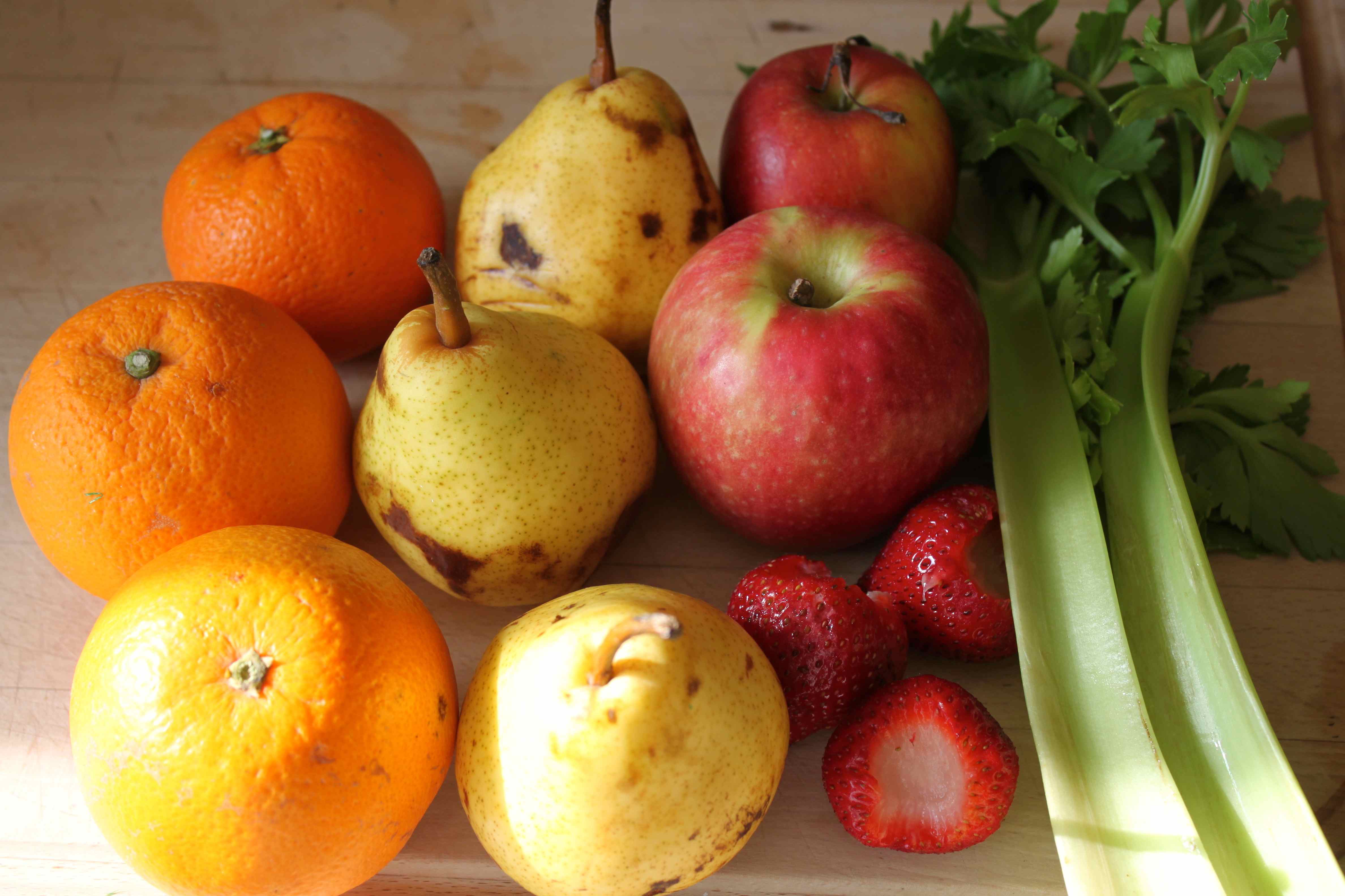 I made a large juice for breakfast with oranges, pears, apples, strawberries and celery.