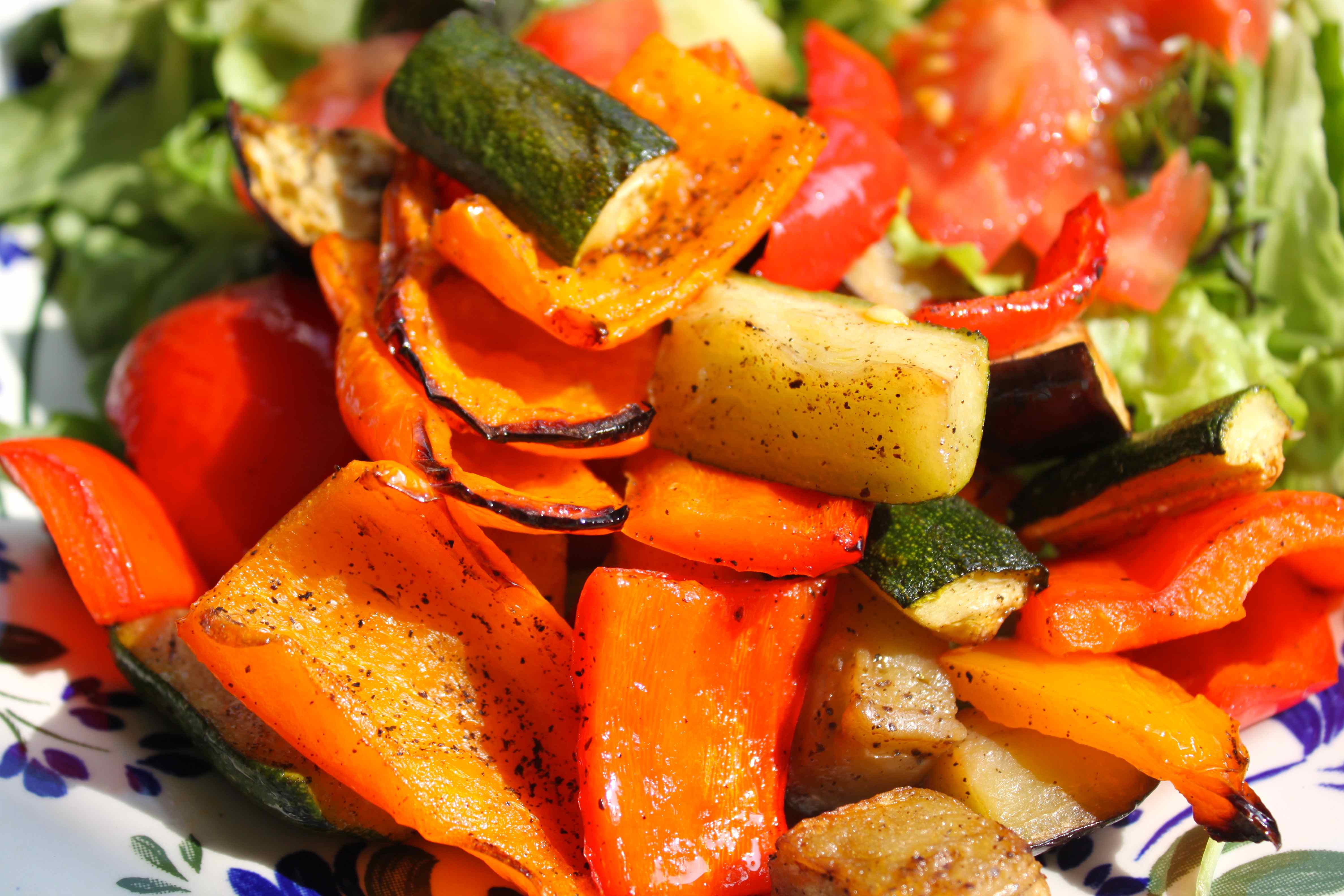 Lunch was a huge big salad made with mixed green leaves and tomatoes and a selection of roasted vegetables: courgettes, peppers and aubergine.