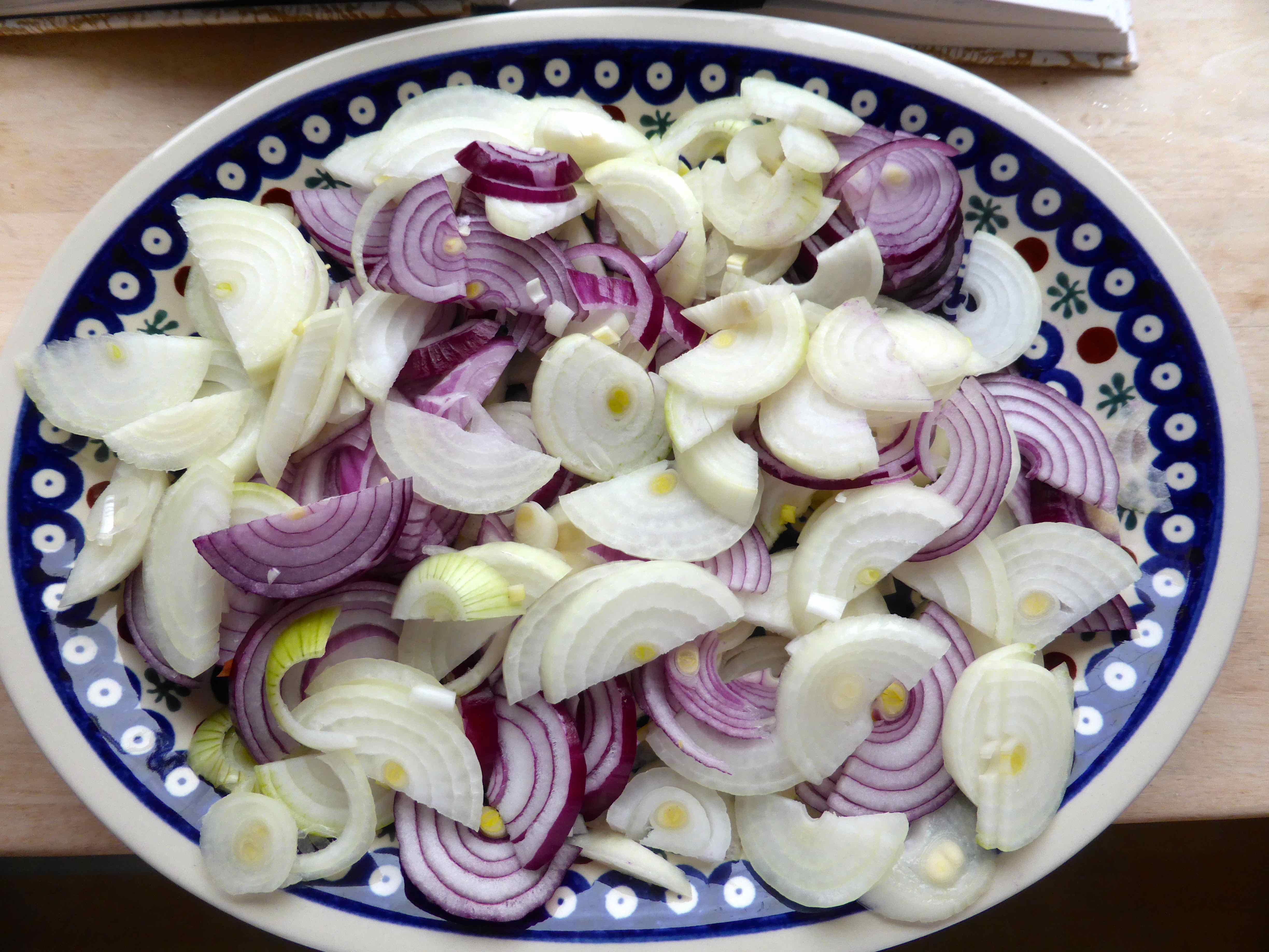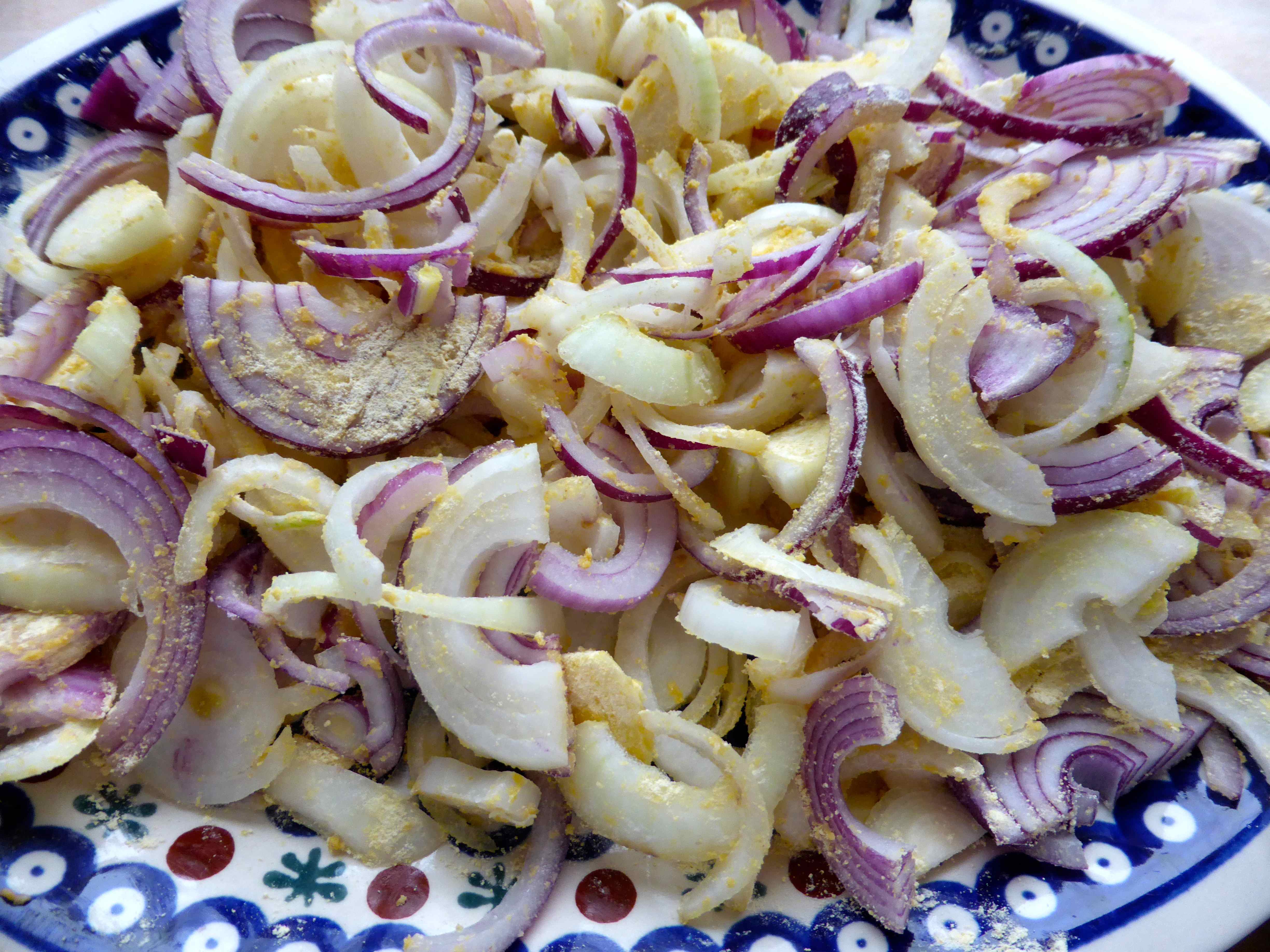 Peel and slice the onions thinly and place on a large flat plate.