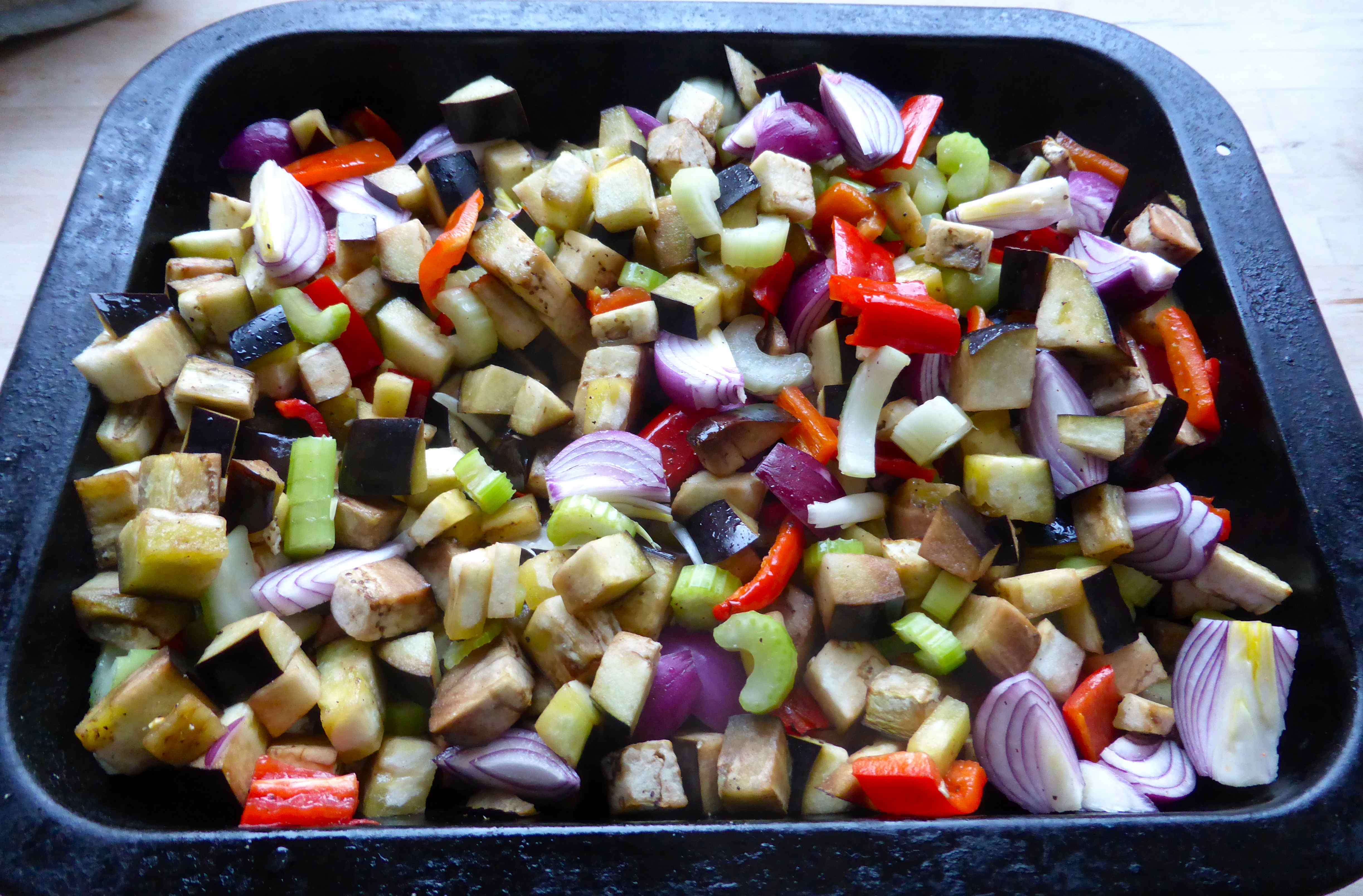 When the vegetables are cooked, mix with the tomato sauce and return to the oven for 10 minutes.