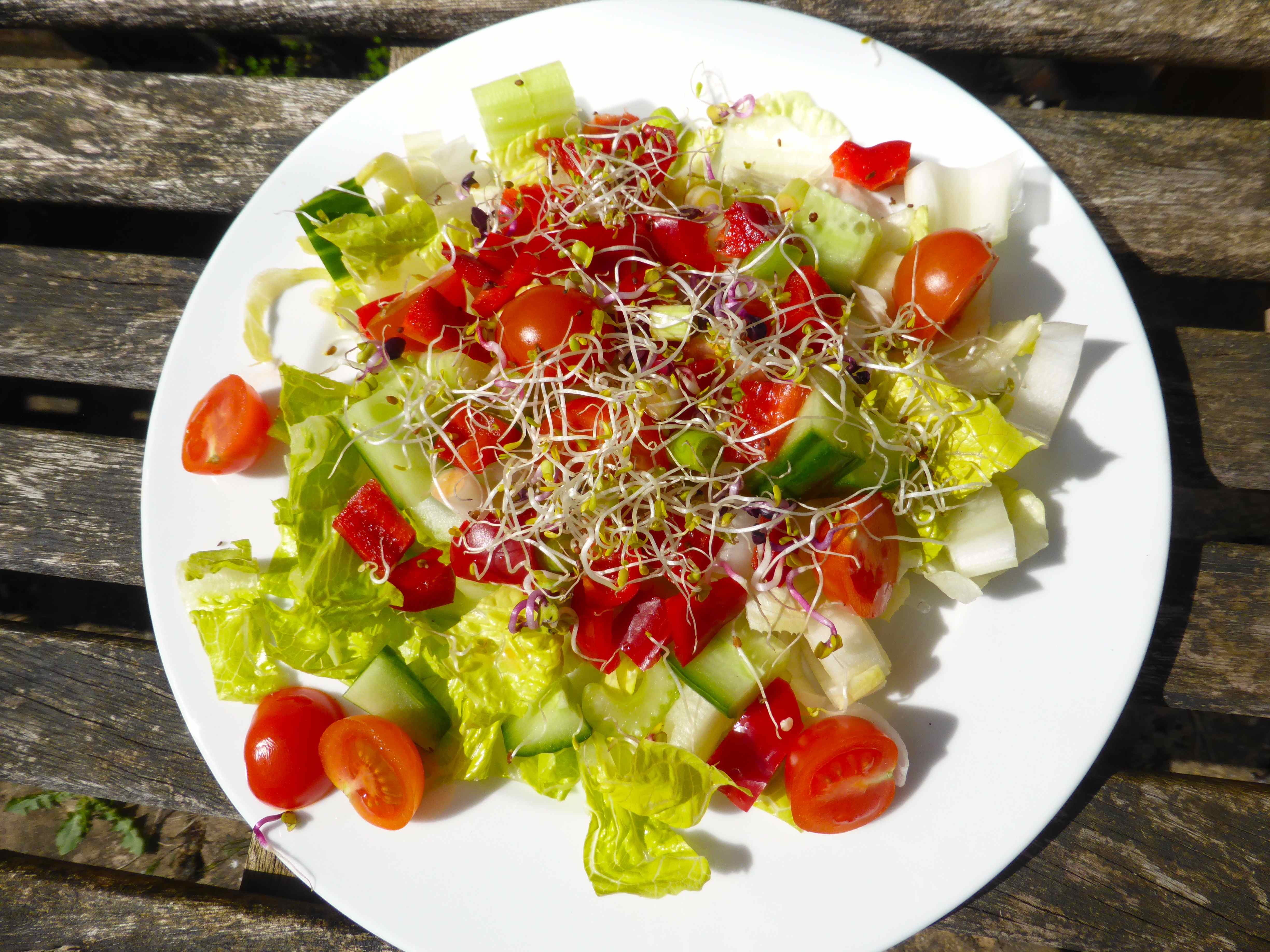 A simple fruit platter for breakfast: watermelon, red grapes, pink grapefruit and orange.  Eaten in the sunshine and every mouthful was a complete pleasure.4 fruit breakfast I spent lots of time in this part of the garden today.potting area 2 This shady spot under the huge magnolia tree needs a good sweep and tidy up but it serves as my potting shed and is a pleasant place to spend the morning.  The trees have grown so much since we moved here and so this little greenhouse is too shady to use.potting area 1 This is the lovely greenhouse I had installed last year and which I love as it is so wide.  I sowed seeds this morning for rocket, mizuna, spinach, courgette, purple string beans, cherry tomatoes and plum tomatoes.  I wanted to sow lettuce but have no seeds so I must get some.empty greenhouse 1 Lunch was a bowl of brown Basmati rice and stir fried veggies, including the swiss chard and spring onions from the garden.  It was so good to be picking veggies from the garden, cooking and eating them – it doesn’t get much fresher than that!swiss chard and spring onions I stir fried in water rather then oil, the following: garlic, broccoli, red pepper, celery, mushrooms plus the swiss chard and spring onions.  Eaten with some soy sauce and chilli flakes.  It was so good.stir fry veg in bowl We sat outside but actually there was a chill nip in the air so we moved in to the greenhouse which was delightfully warm.  I could have stretched out in there and had a snooze it was so warm and lovely.chair in greenhouse Harvey thought that sitting in the greenhouse was a strange thing to do but I am thinking it is quite an obvious thing to do and will be doing so again.  A room with a view 🙂lunch in the greenhouse The dogs liked it in there too.boy and dog For supper I made an oven cooked ratatouille from Hugh F-W’s ‘Veg Everyday!’ cookbook.  It is really easy to make and tastes amazing.  If you like ratatouille, make this version as it is fantastic.