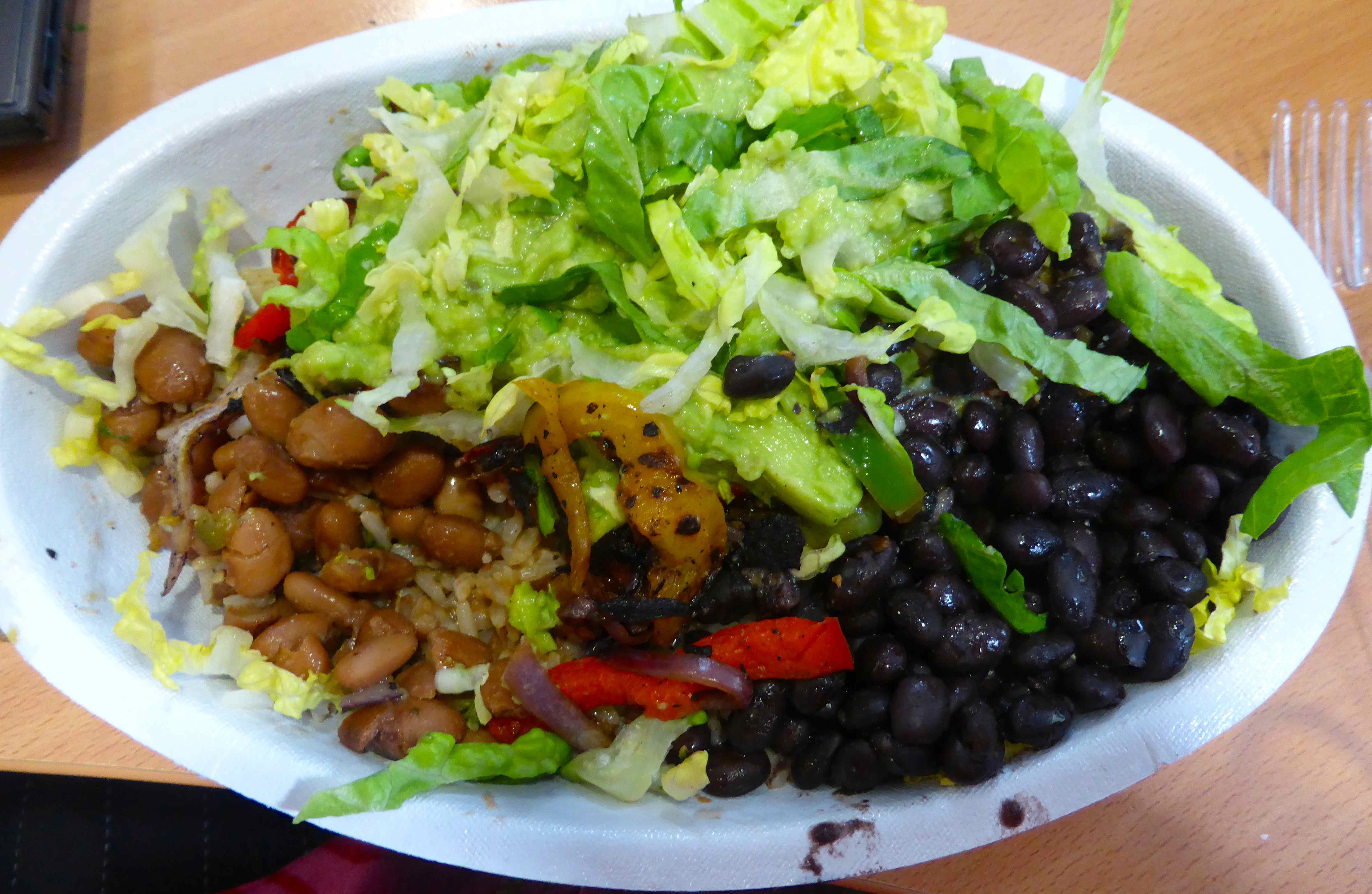 At lunch time I went back to Chipotle. I had been advised by my colleagues to go for the Vegetable basket instead of the burrito because it is much easier to eat and you actually have more filling than you do in the burrito. Plus it is so much easier to eat and I am trying to not have wheat so there’s another bonus. I had exactly the same as yesterday except with mixed beans ie black and pinto beans.