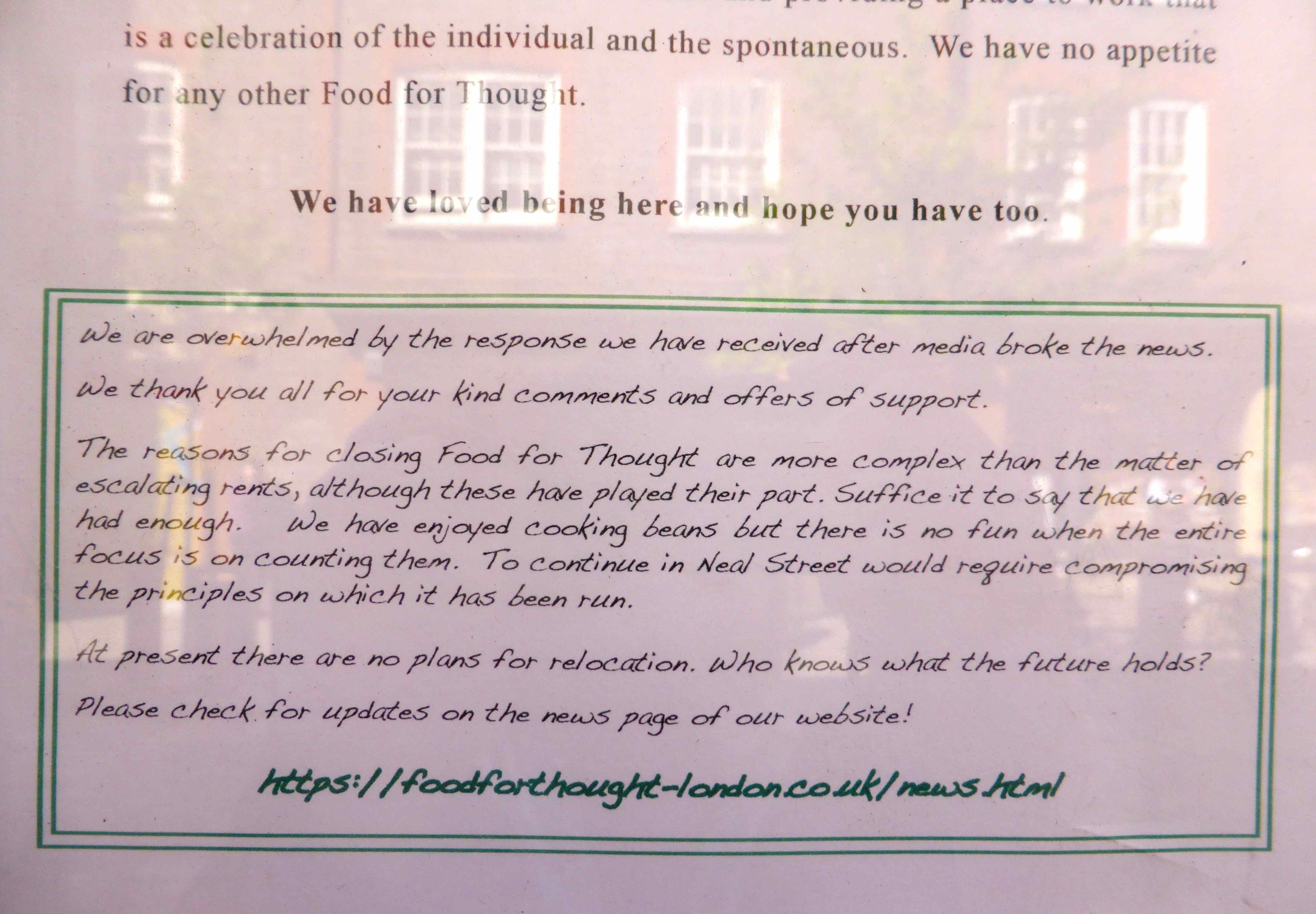I went to Food For Thought at lunch time as I need to make the most of it before it closes down after 40 years. They have added a letter to their noticeboard.