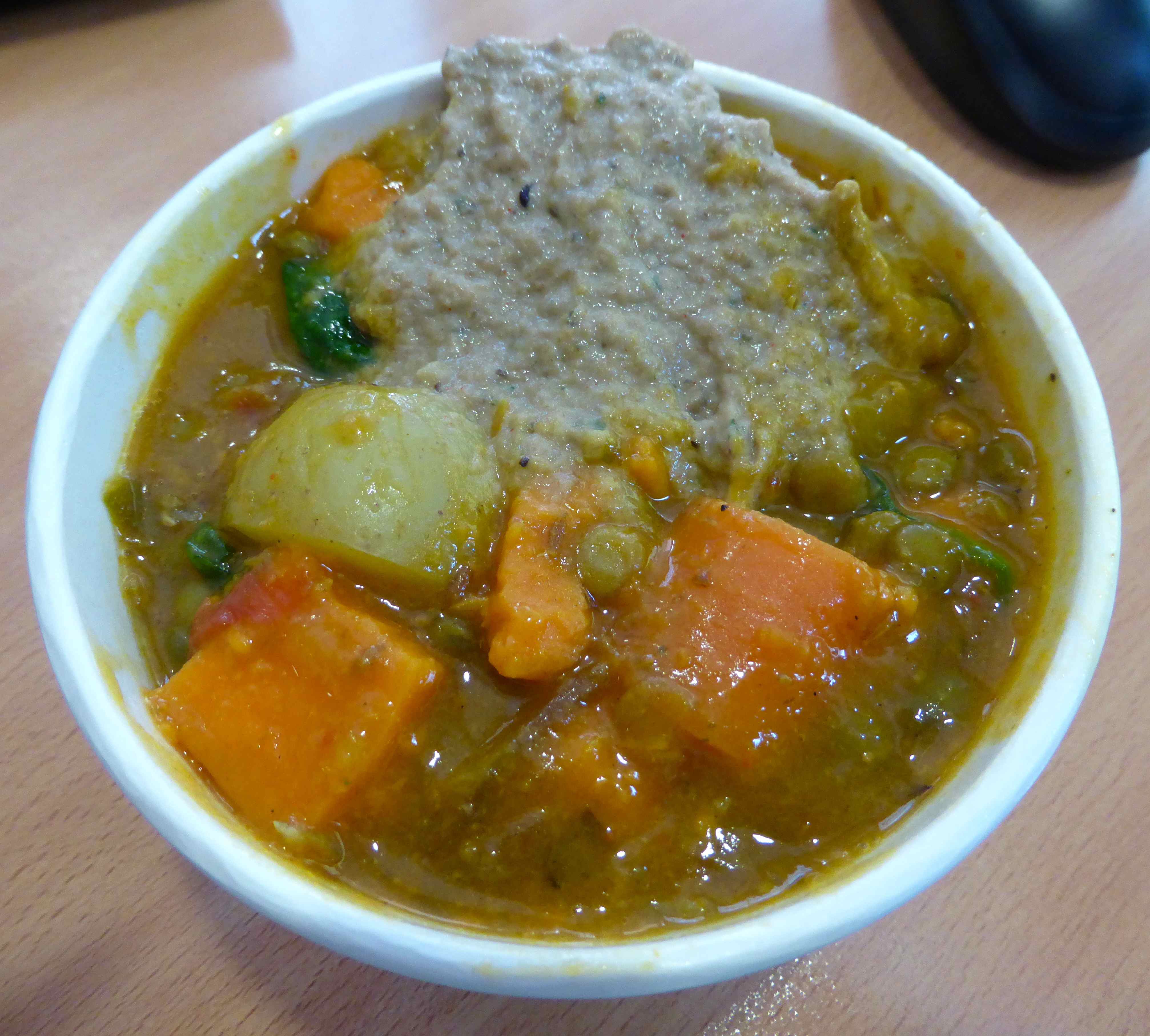 Served with rice, it was made with green lentils, carrots, potatoes, spinach and a tasty sauce. Quite small but very yummy and I would have that again. If I can! Sob.