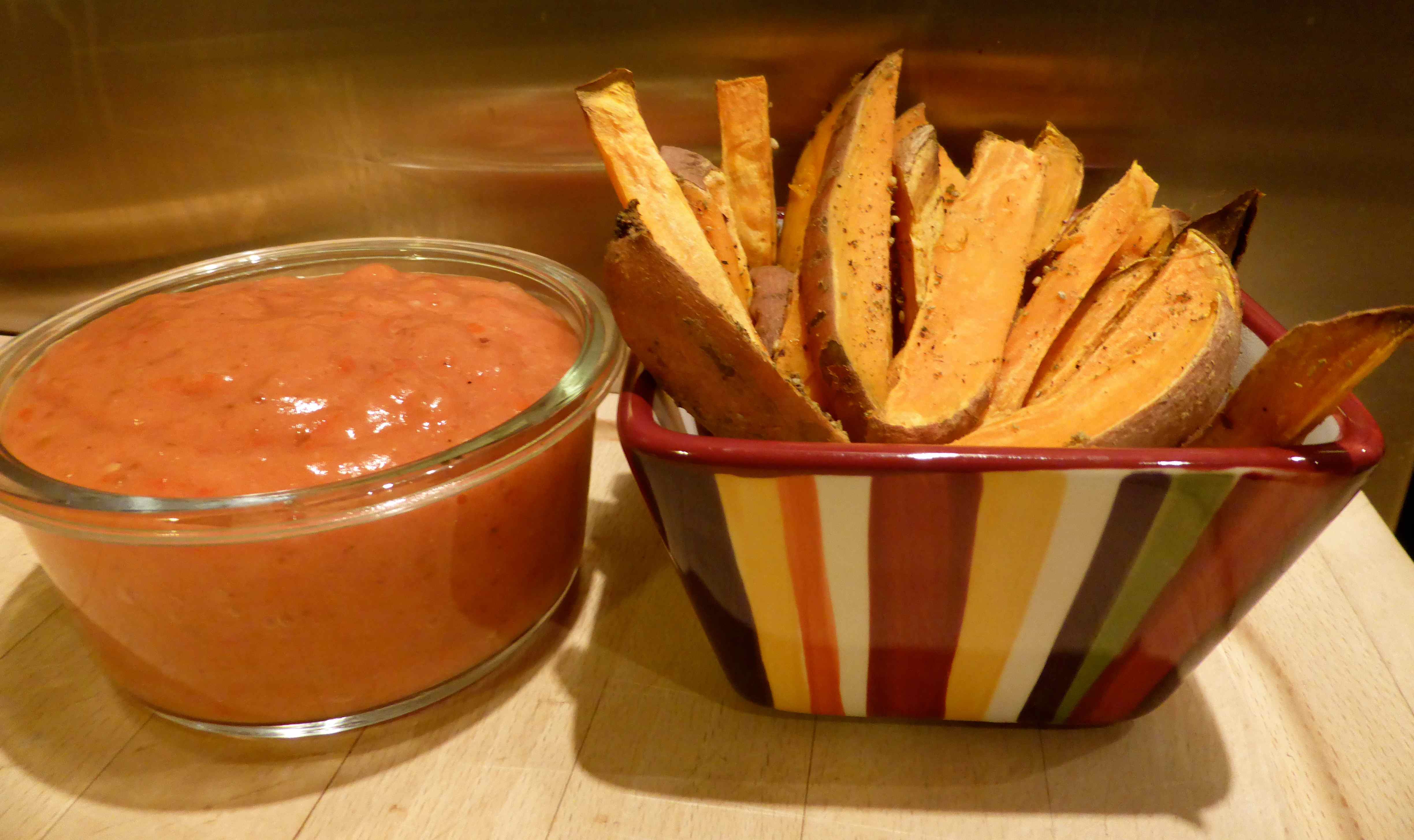 I made a dipping sauce with 4 vine tomatoes, 7 Medjool dates and the juice of half a lime. I just blitzed them in the blender until it was smooth.
