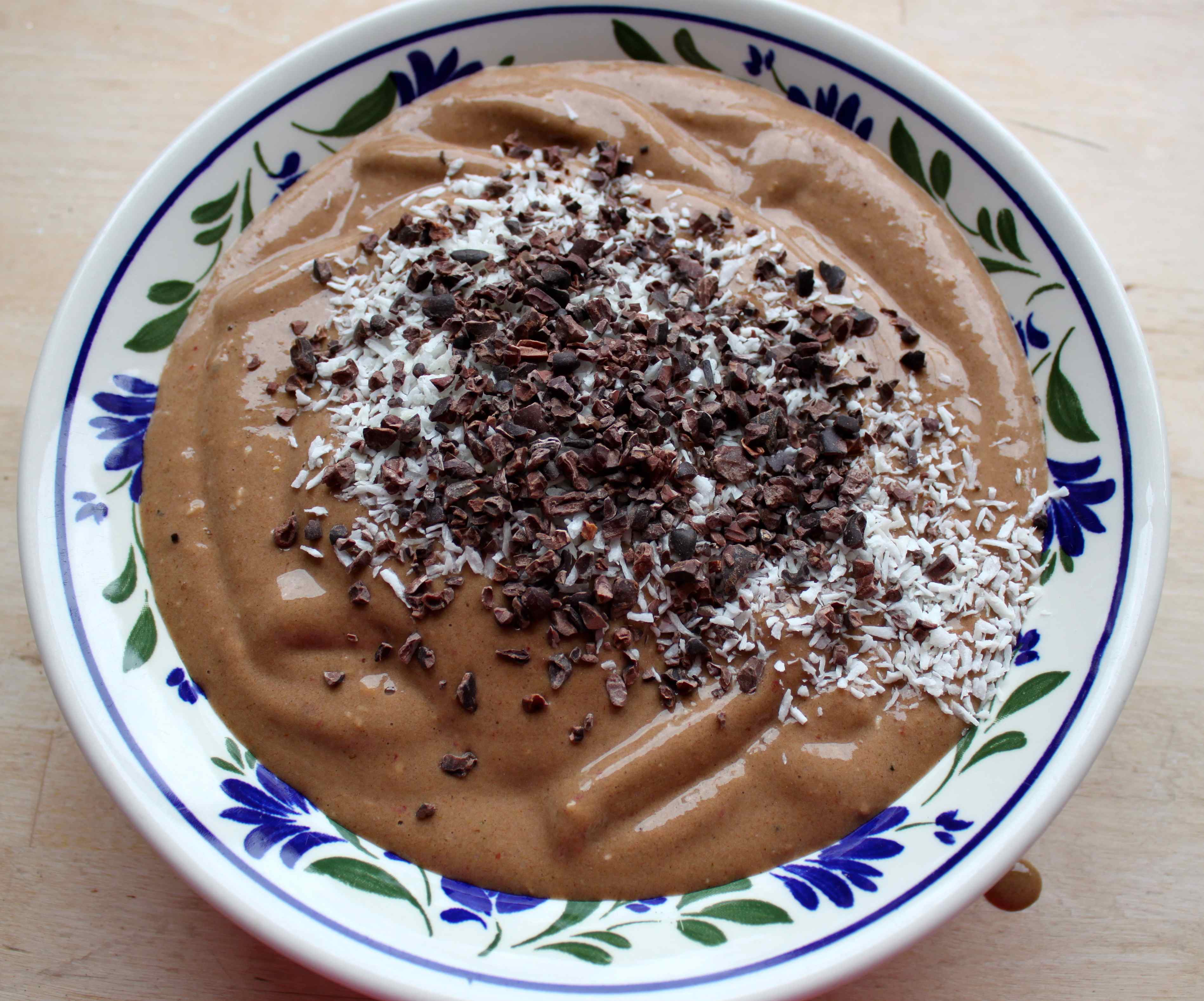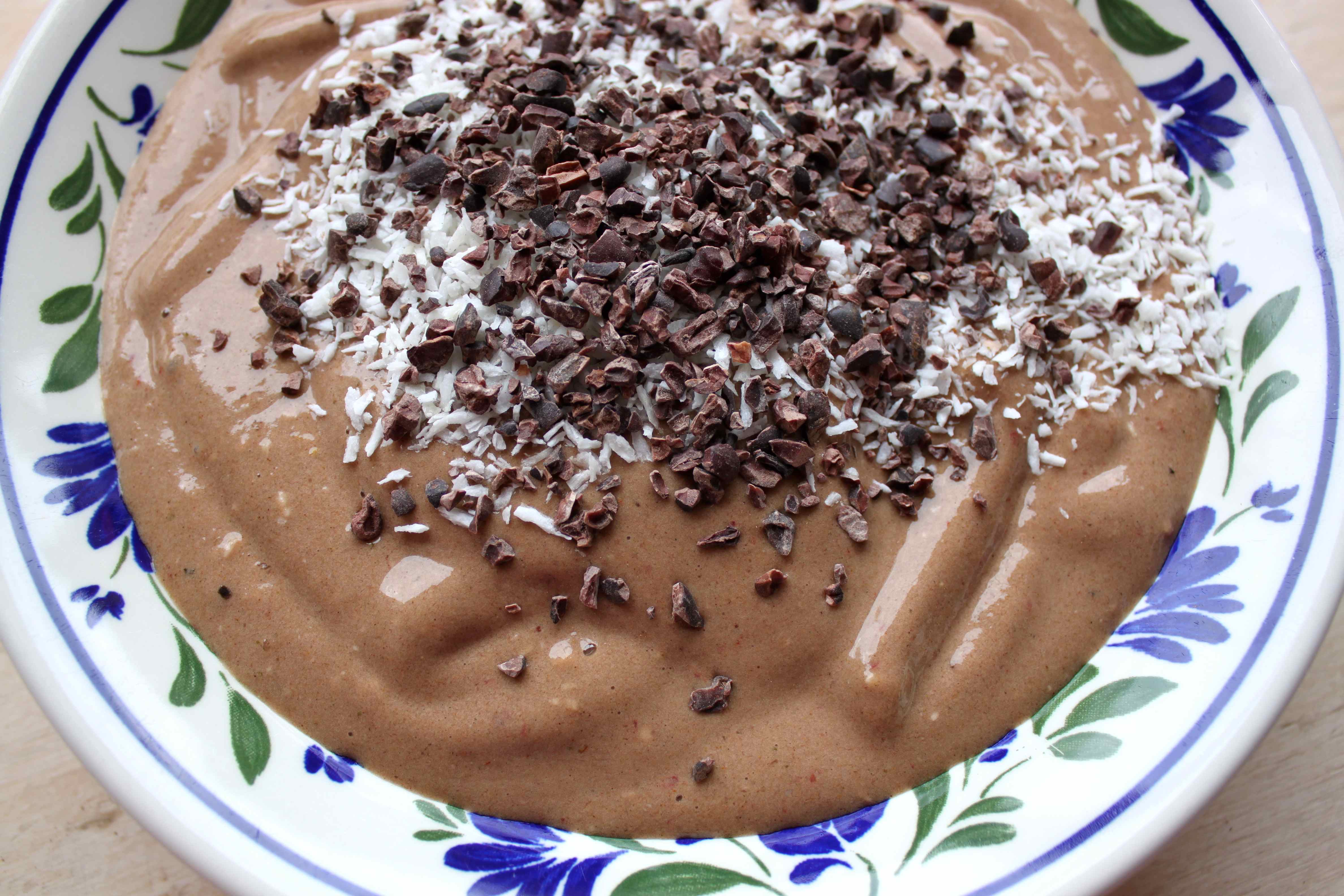 3 frozen bananas, about 10 fresh strawberries, maca powder, green sea greens, cacao powder, coconut, almond milk and topped with coconut and cacao nibs.