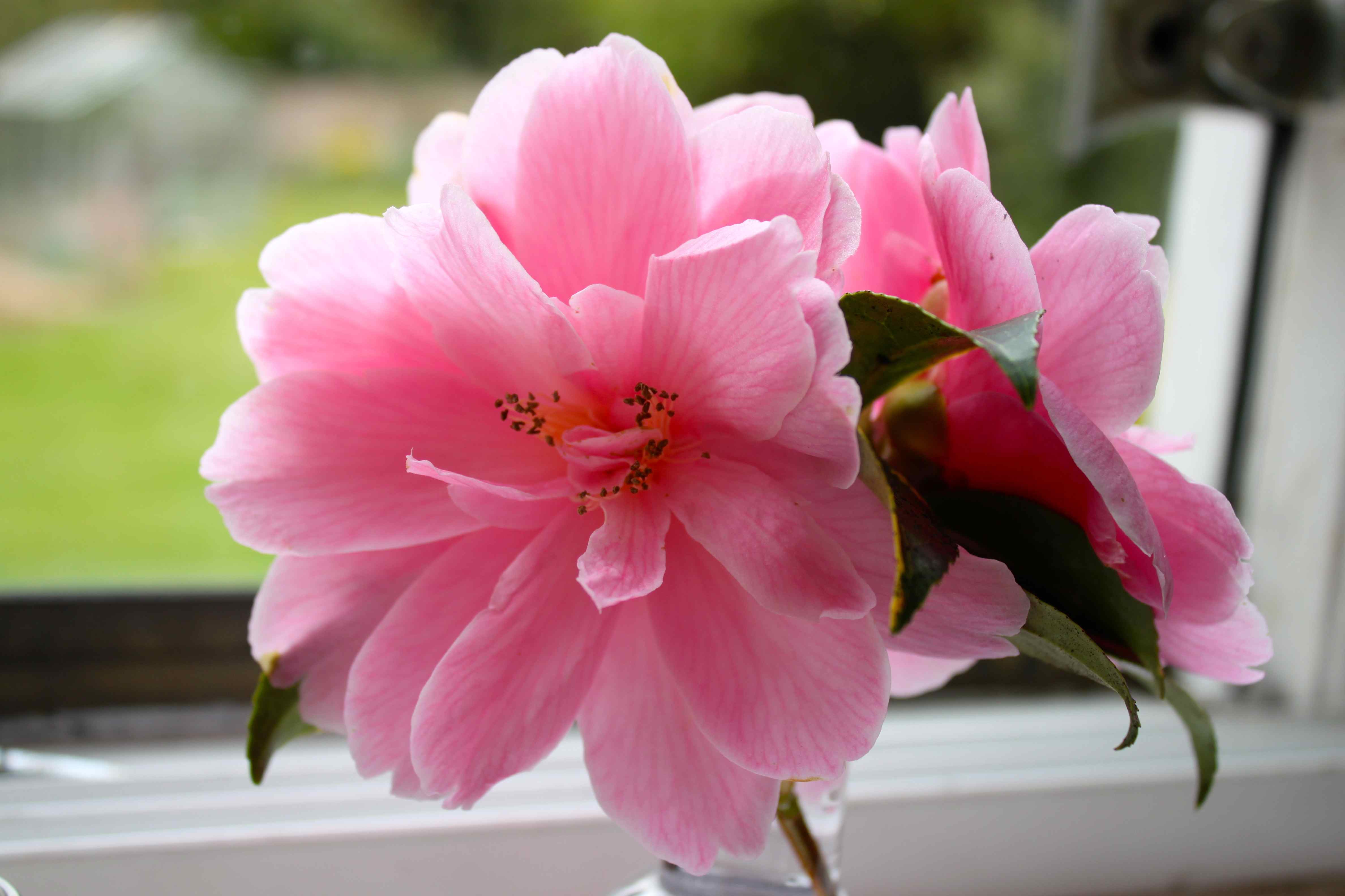 I shut down my lap top at 5:00 on the dot today so my long weekend could begin. I wanted to see a beautiful flower on my kitchen window sill and this was the prettiest one I could find in my garden. A beautiful pink camellia.
