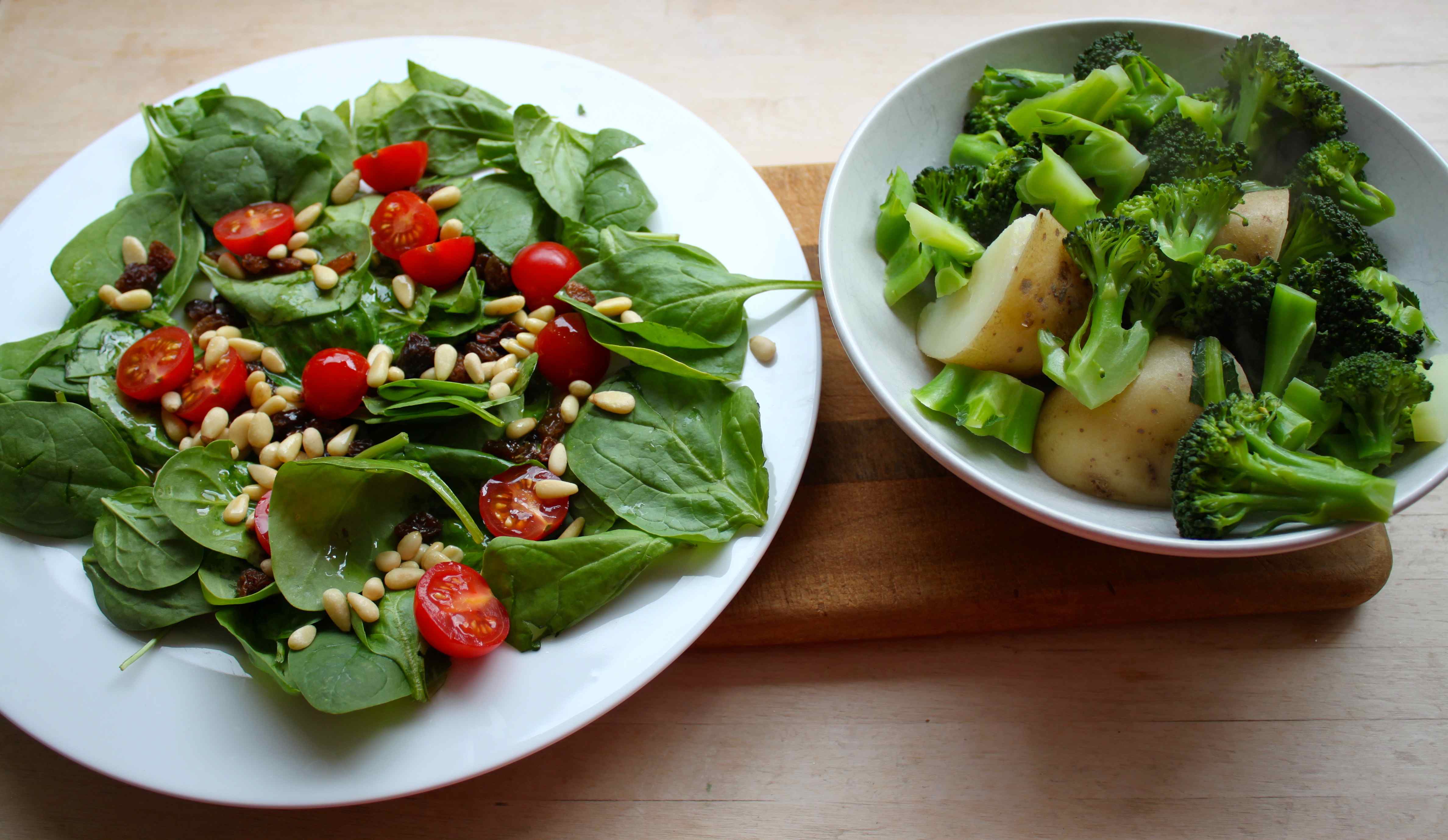 For lunch I made a salad a colleague at work had recommended I try. Spinach with 1 tbsp sultanas, 1 tbsp toasted pine nuts and less than a tbsp each of maple syrup and olive oil.