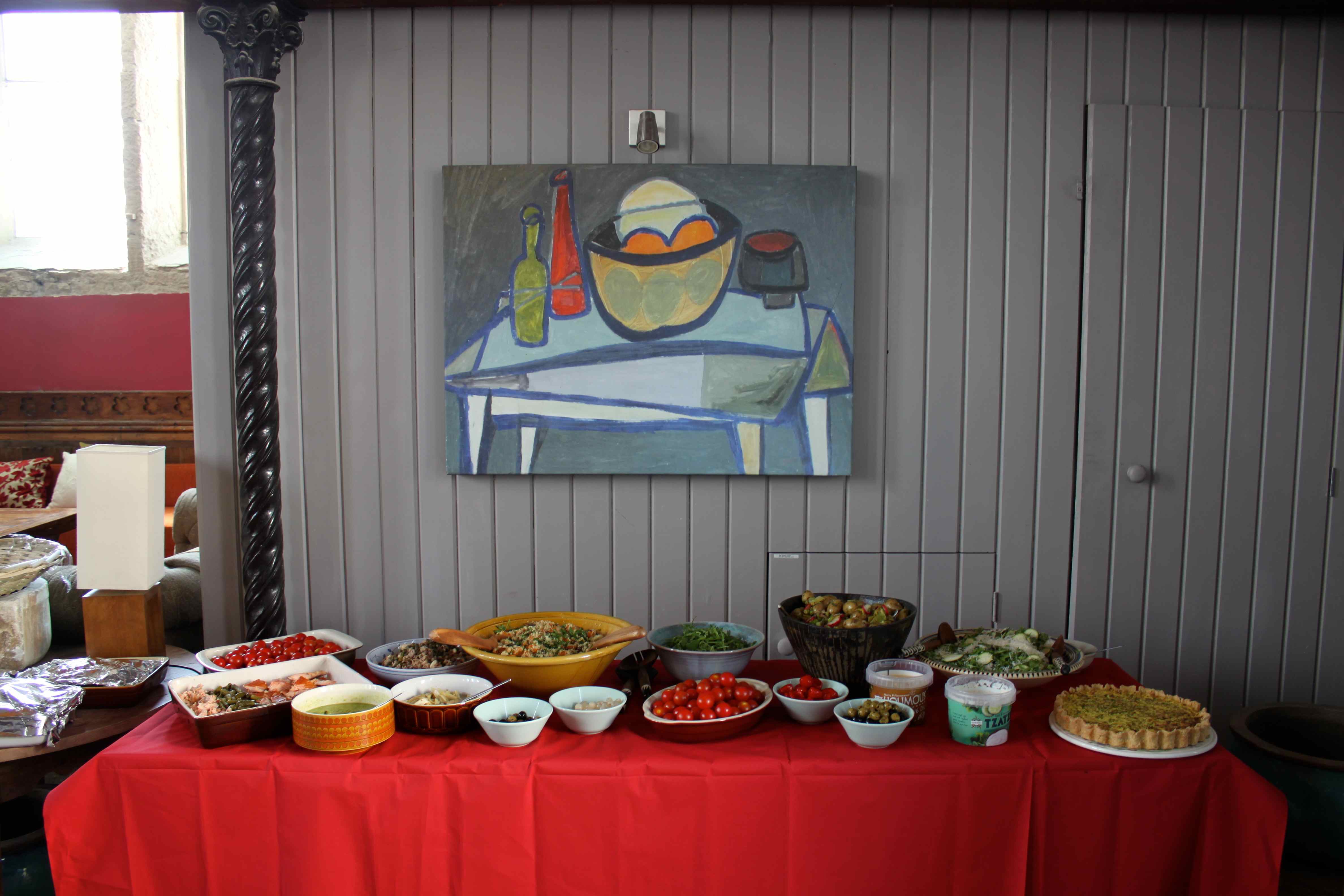 Quiche, an amazing salad (recipe from ‘Polpo’) made with courgette, rocket and parmesan, potato and radish salad, a green salad, peppers, olives, houmous, tzatziki,