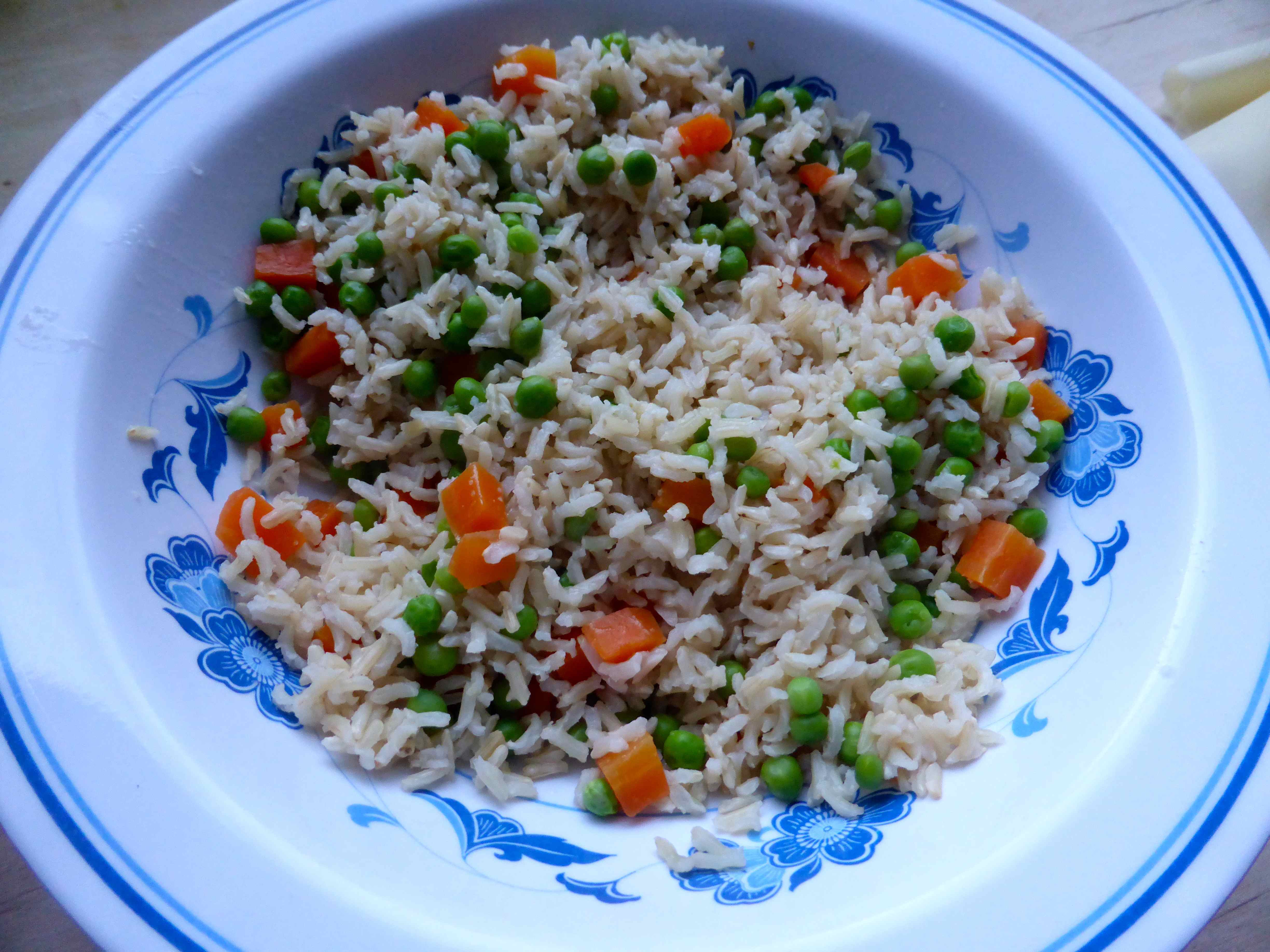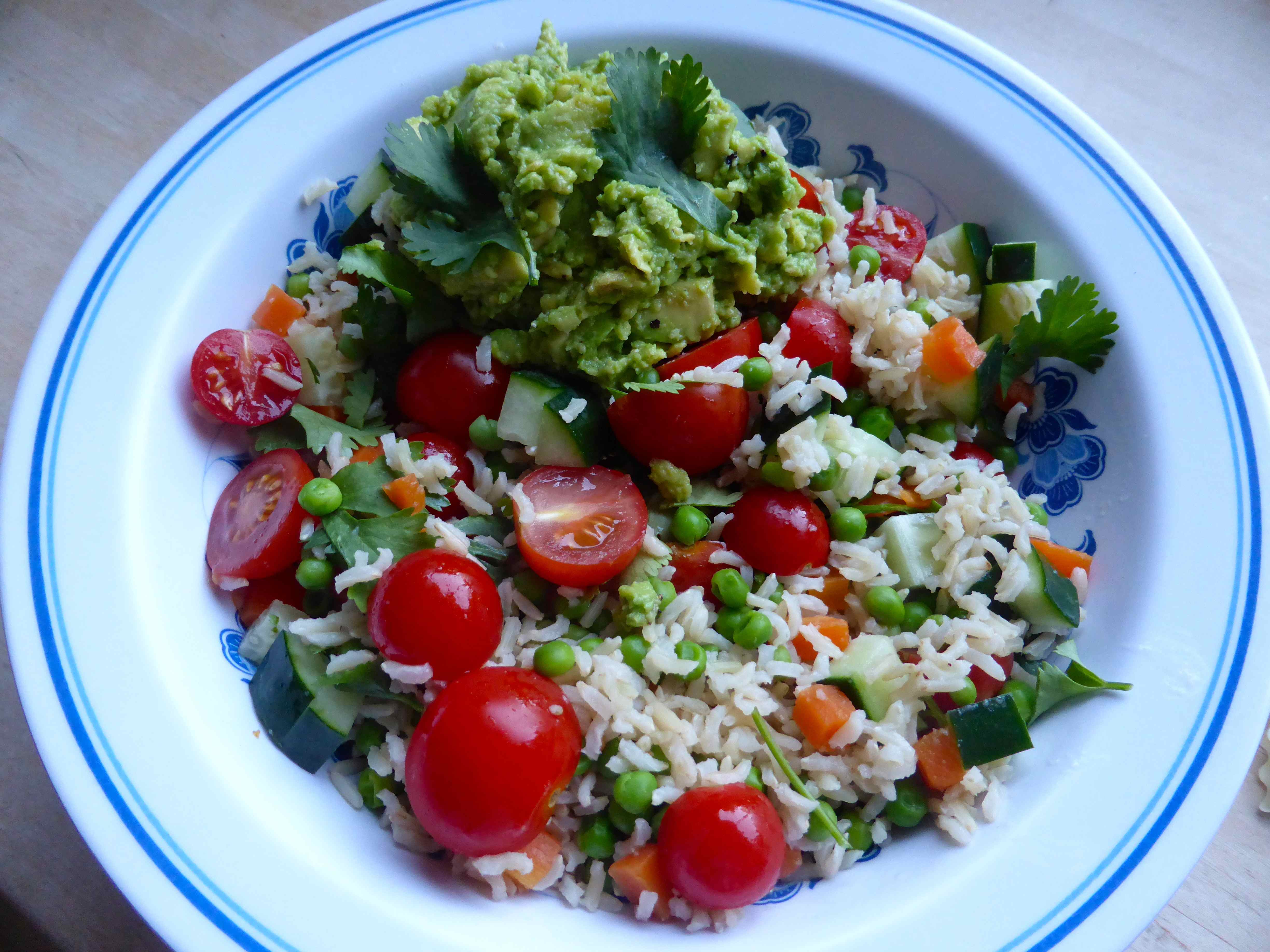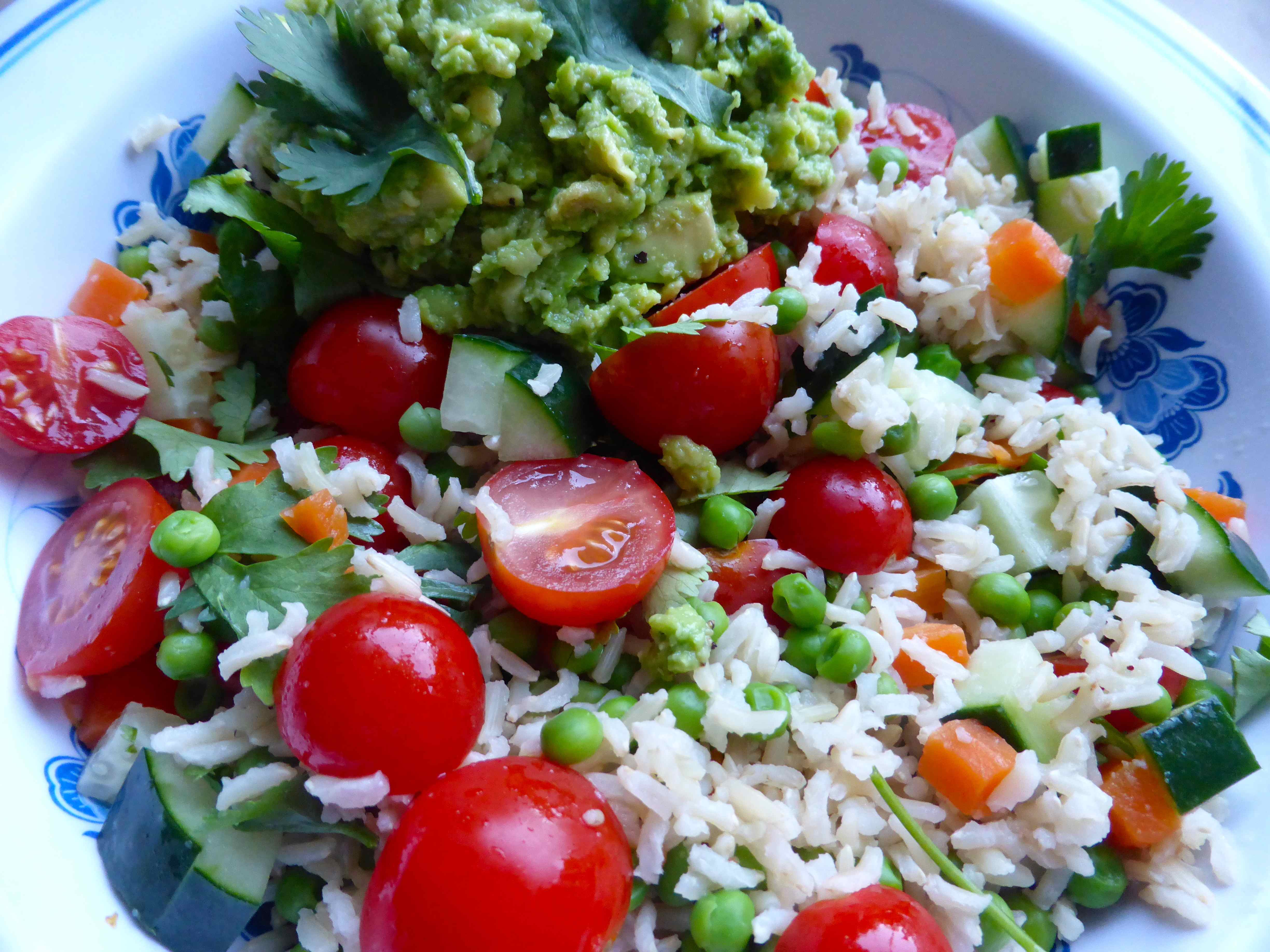 I served the avocado, tomatoes and cucumber with some brown Basmati rice, peas and carrots.