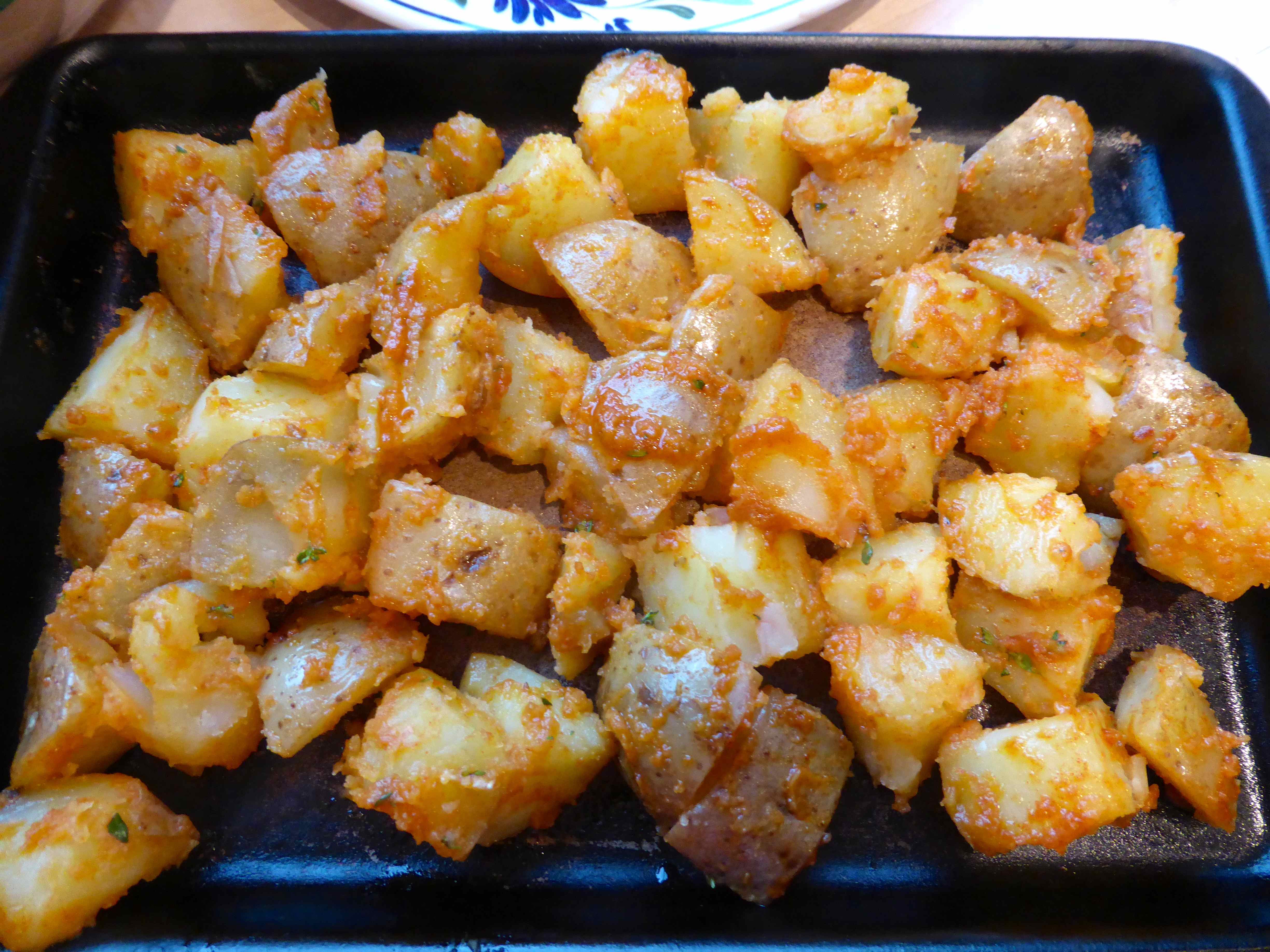 We had baked potatoes. I par boiled the potatoes for 10 minutes, drained them and then coated them in a little olive oil, thyme, paprika and garlic and baked them in the oven on 200°C for half an hour so they crisped up.