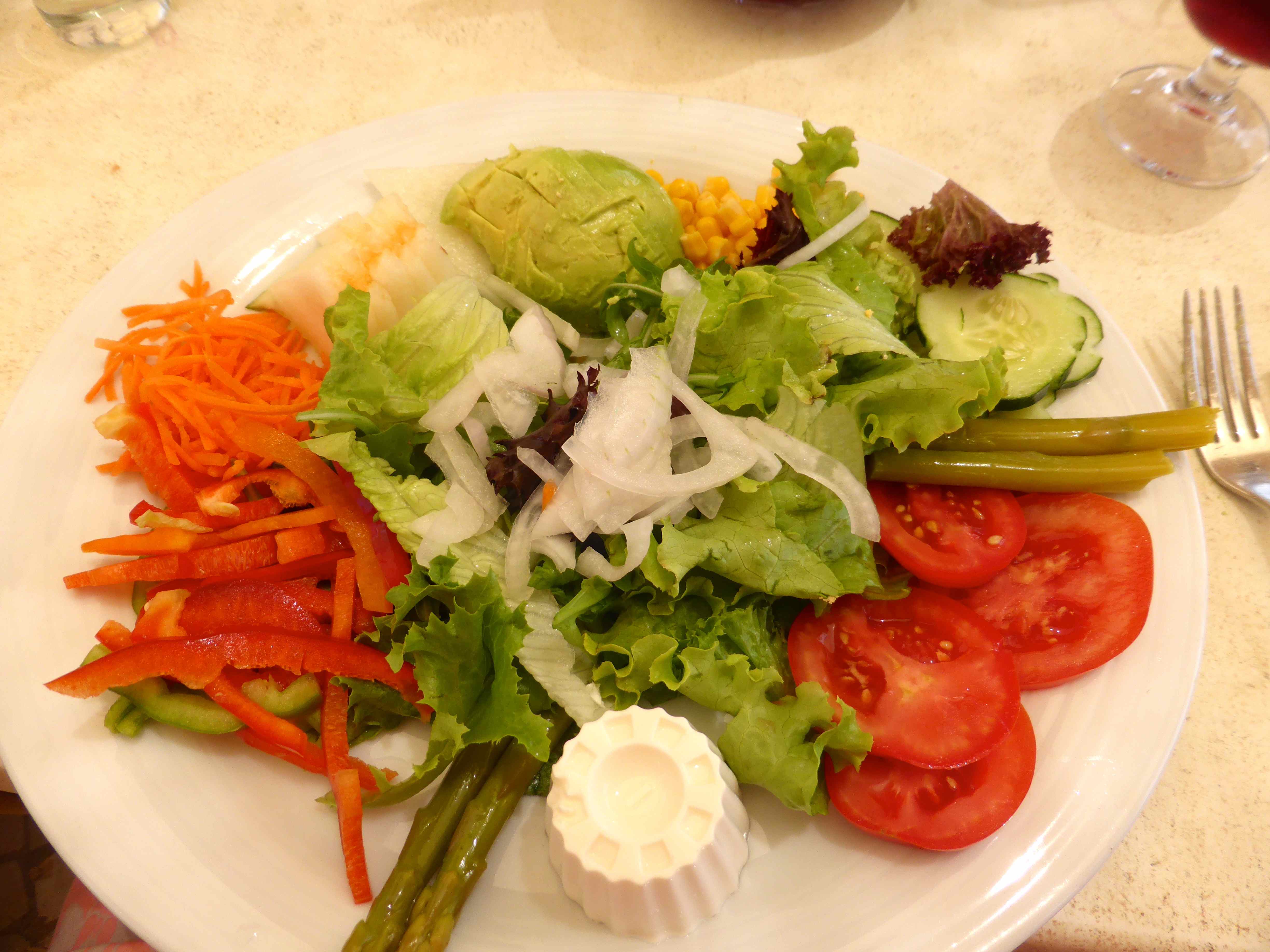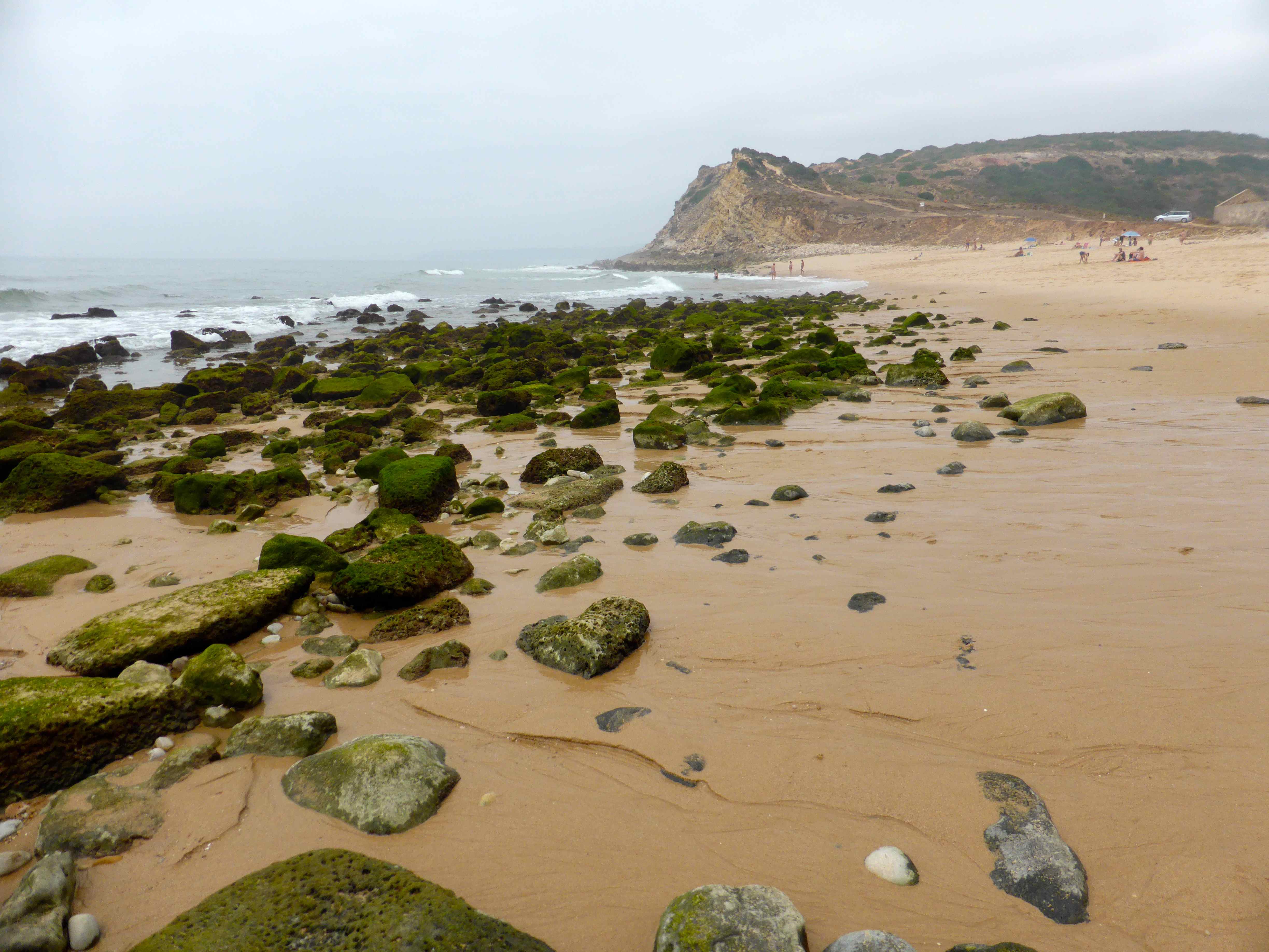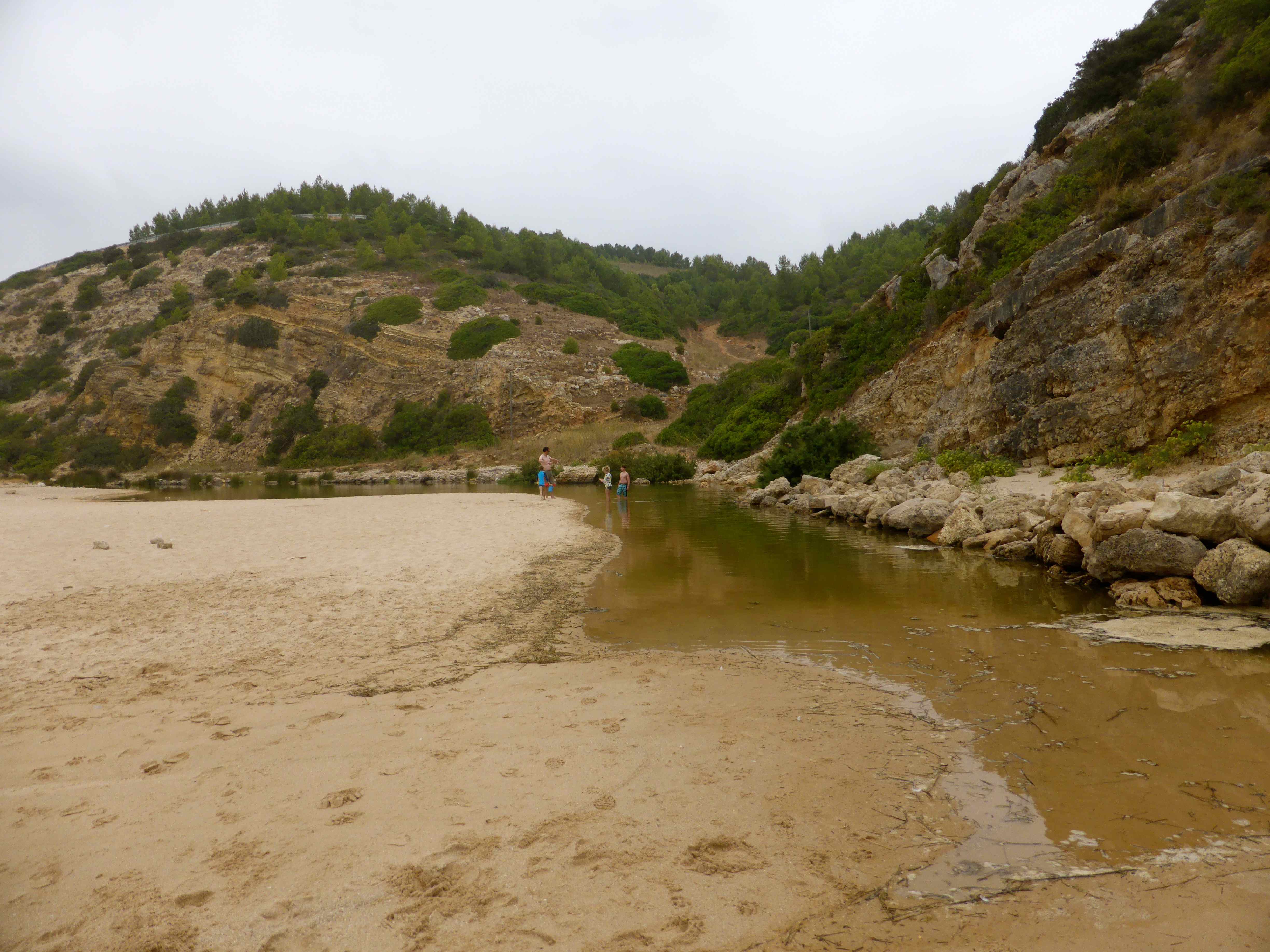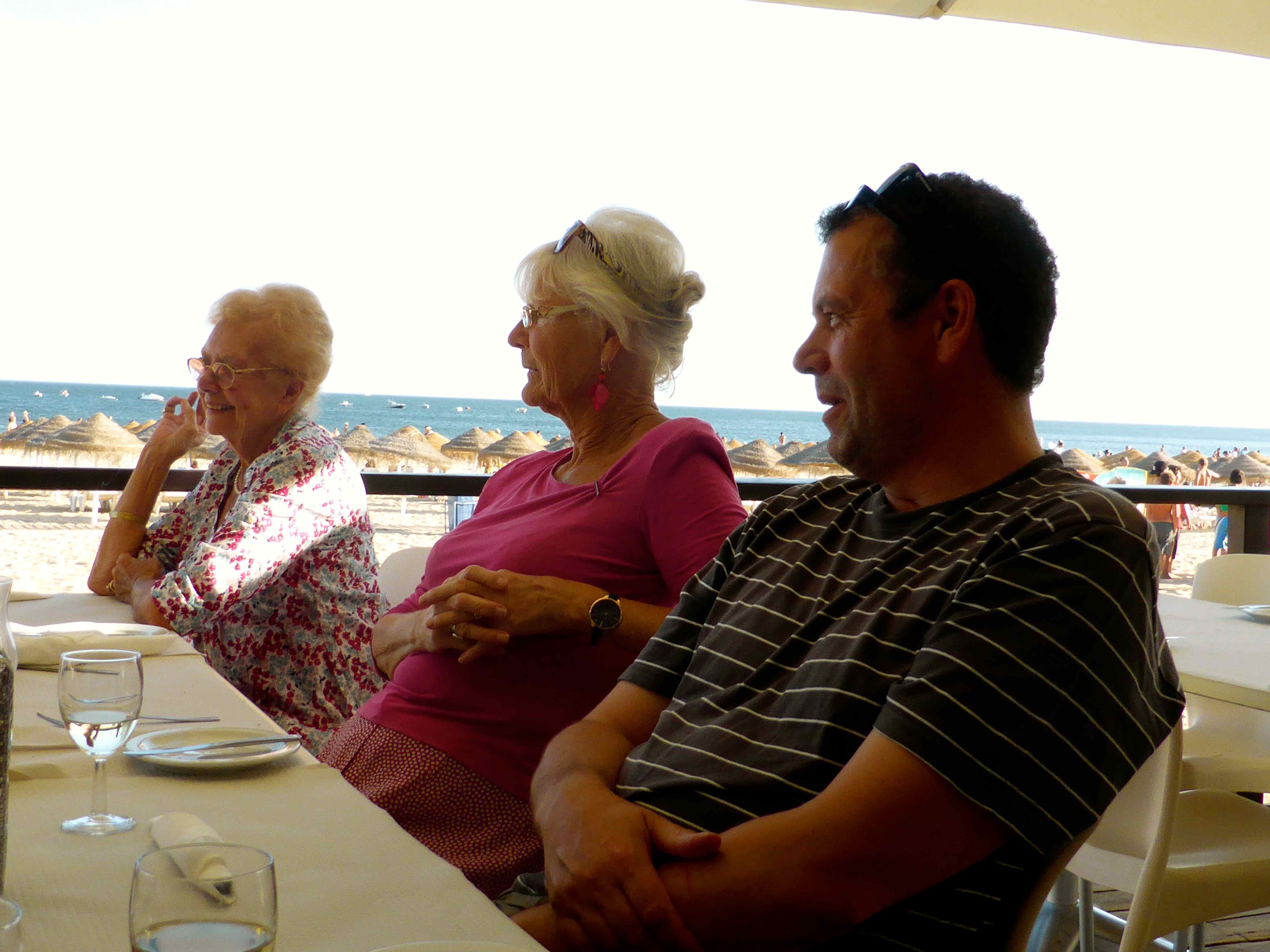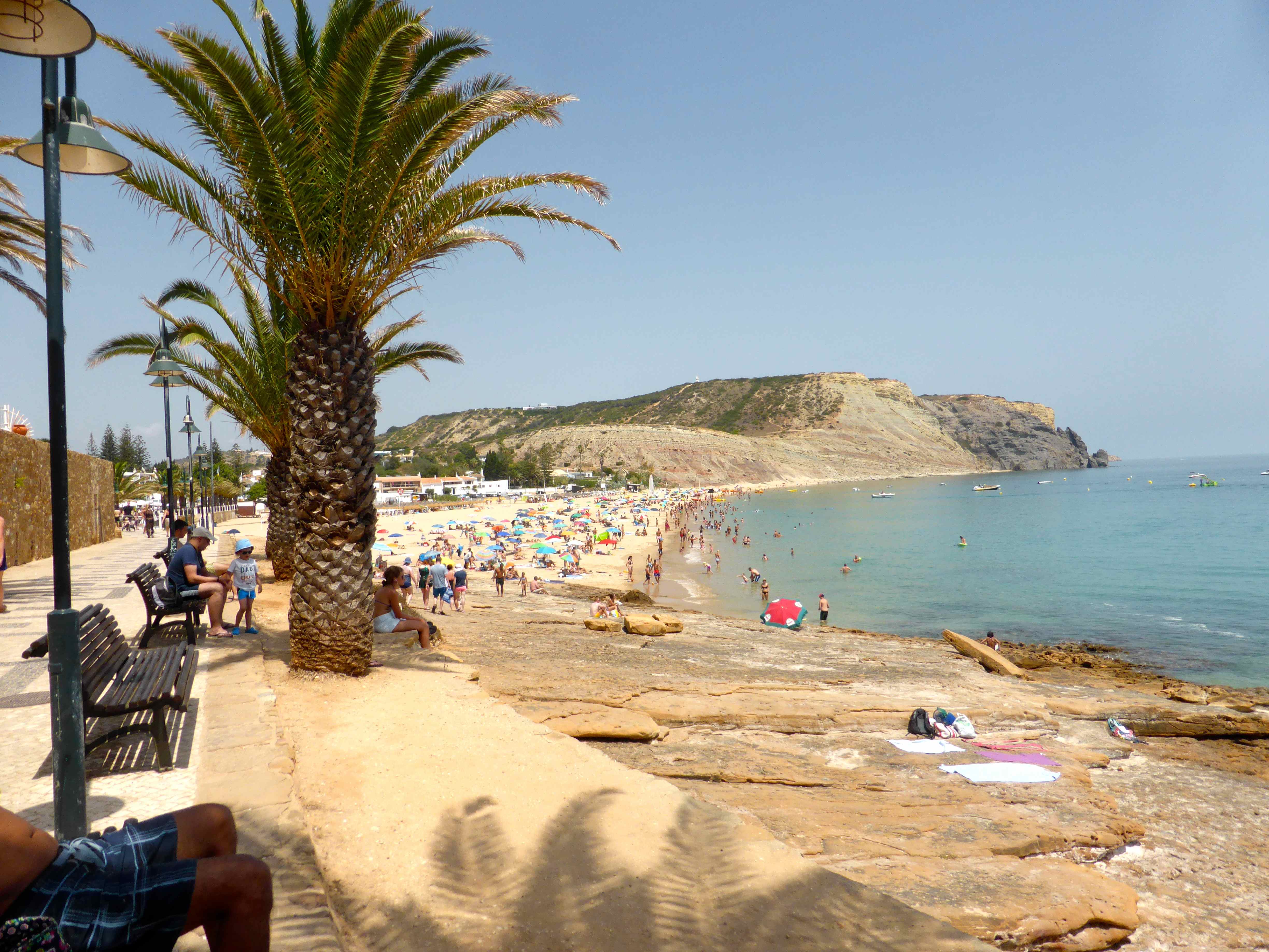 Fortaleza da Luz dining area There was a jazz band playing in the grounds which added to the charm of this place, situated at the opposite end of town to our villa, next to the large church.Fortaleza jazz band There was a fixed price menu.  We have been pleasantly surprised by the prices here which are cheaper than at home.Fortaleza da Luz menu We had a table overlooking the beach.  This is the view towards rocky outcrops on the western side of town.view from Fortaluza It was a very hot day – cheers !Fortaleza da Luz We got through a few of these jugs of Sangria.Sangria The kean eyed may have noticed there were no vegetarian options on the menu but the staff were very obliging and brought me a salad for starter.  It may look plain but the vegetables were so fresh I really enjoyed it.  We had previously enjoyed bread with olive oil and garlic and olives. salad starter As a main they made me another salad which was again, fresh and flavoursome.  It came with an egg and some cheese which I donated.vegetarian salad It was a very hot walk back to the villa, through the pretty cobbled streets of Luz.Praia da Luz 2 Harvey is now nearly as tall as his sister.Praia da Luz 1 Our villa is the farthest building at the opposite end of the beach from where I stood to take this picture which is perfectly located for town and beach.Praia da Luz Our time in the pool has been great fun but we decided it could be enhanced with some inflatables.inflatables Fun became even more fun.Luz pool 2 H on dolphin What a shame Sundays can’t always be like this!Luz pool 1 The beanbags at the villa are perfect for some quiet time and relaxing.L and H beanbags We had a simple supper in the villa after our huge lunch.  More salad and bread and loads of fruit but I did also have some cheese which is the one bit of dairy I am finding hardest to give up.  The Brie, bought from the local supermarket was good.salad cob On Monday we went to Boca do Rio, a different beach slightly West of Luz.  It was a cloudy morning but warm enough to enjoy a morning on the beach.Boca 5 A river runs along one end of the beach which the children had been planning to build dams across but this area had had a dry Summer so far so the river was not flowing.Boca 4There was enough water to enjoy though.