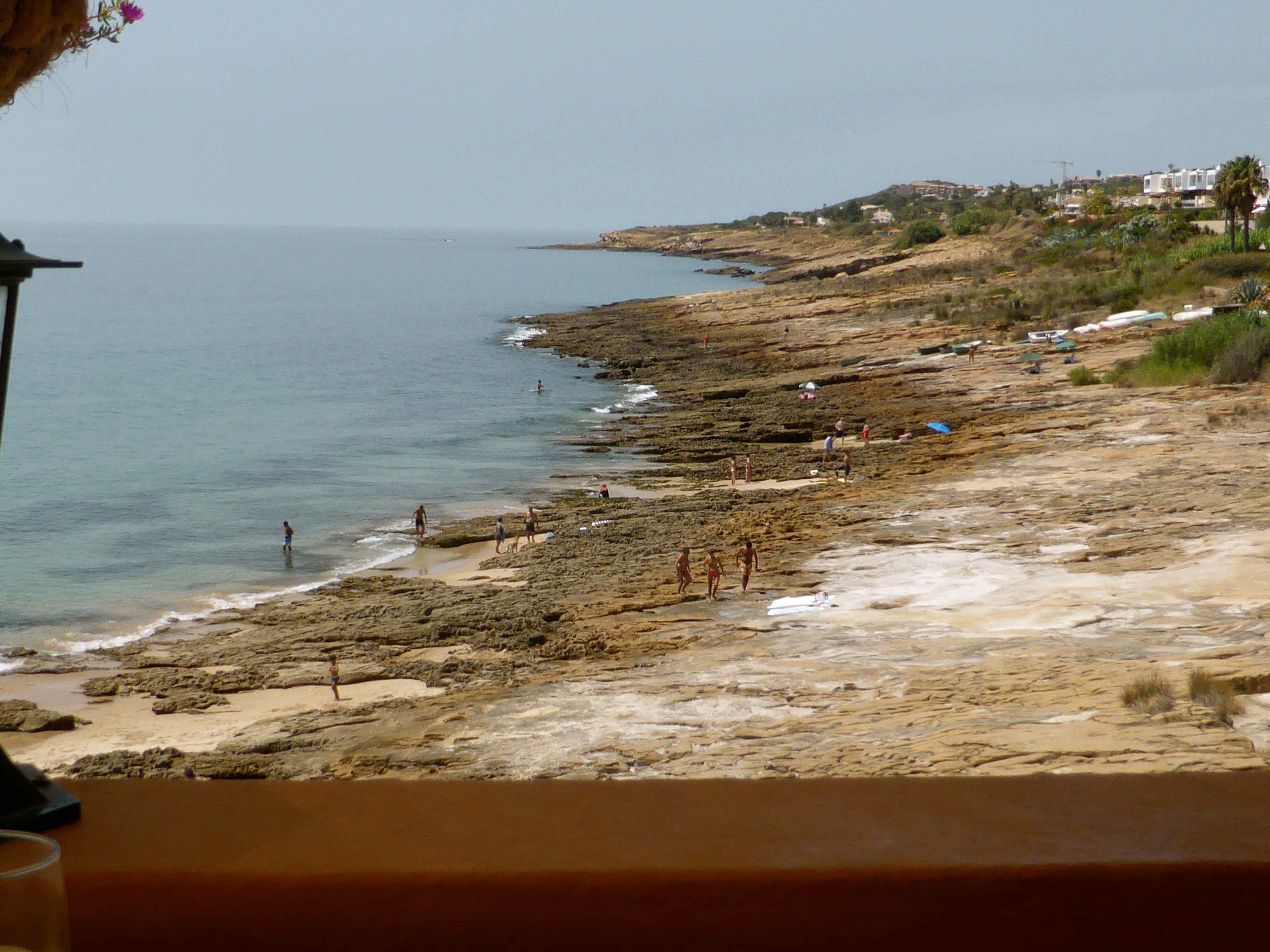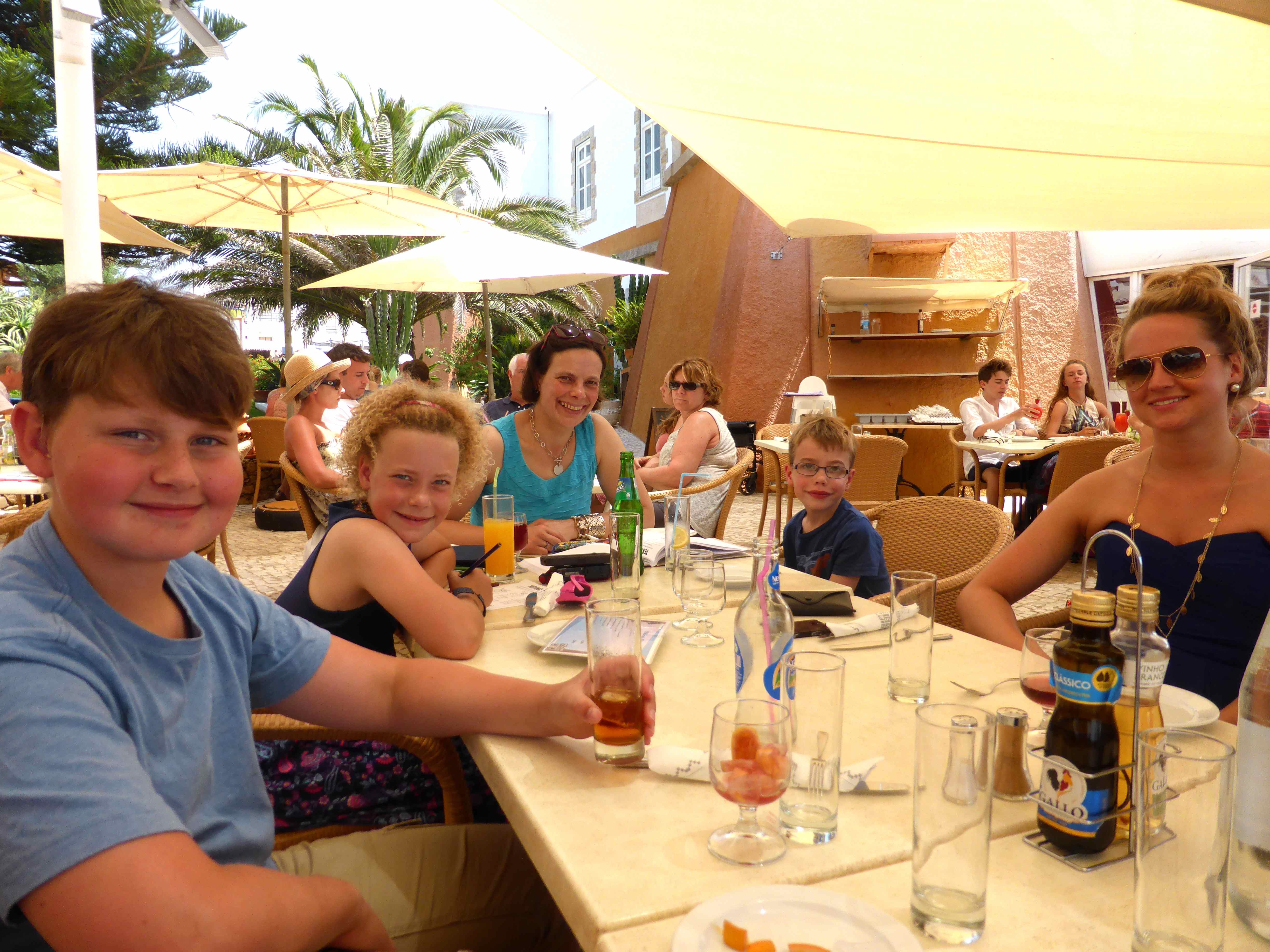 There was hardly anyone here which is our preference.Boca 1 For lunch we went to a nearby town called Salema.  There is a large sandy beach at Salema and a tiny town, filled mainly with pizza places so we settled in the only restaurant that looked as if it served a variety of foods.  I don’t know the name of it which is a shame as the service we so friendly and they had vegetarian options – hurrah.  The ratatouille and polenta chips were the best meal I have had here so far.  Absolutely delicious.mon lunch 2 Everyone enjoyed their meal in here, whether they had salads or fresh sardines.  A big thumbs up from us all.Mon lunch 1 After another relax by the villa pool and a swim in the ocean, we headed in to Luz and ate at Paradiso, our hosts favourite restaurant.  We all like it here.  The restaurant is on the beach and when the children are bored of our chit chat they can go off and play on the beach.Mon dinner 3 Mon dinner 2 They do have 2 vegetarian options and I chose the vegetable burger which was tasty enough but didn’t come with any salad or vegetables.Mon dinner Before and after dinner we spent rather a lot of time in the Mojito bar where things tend to get a bit blurry.  We had a great evening in there 🙂P1050023