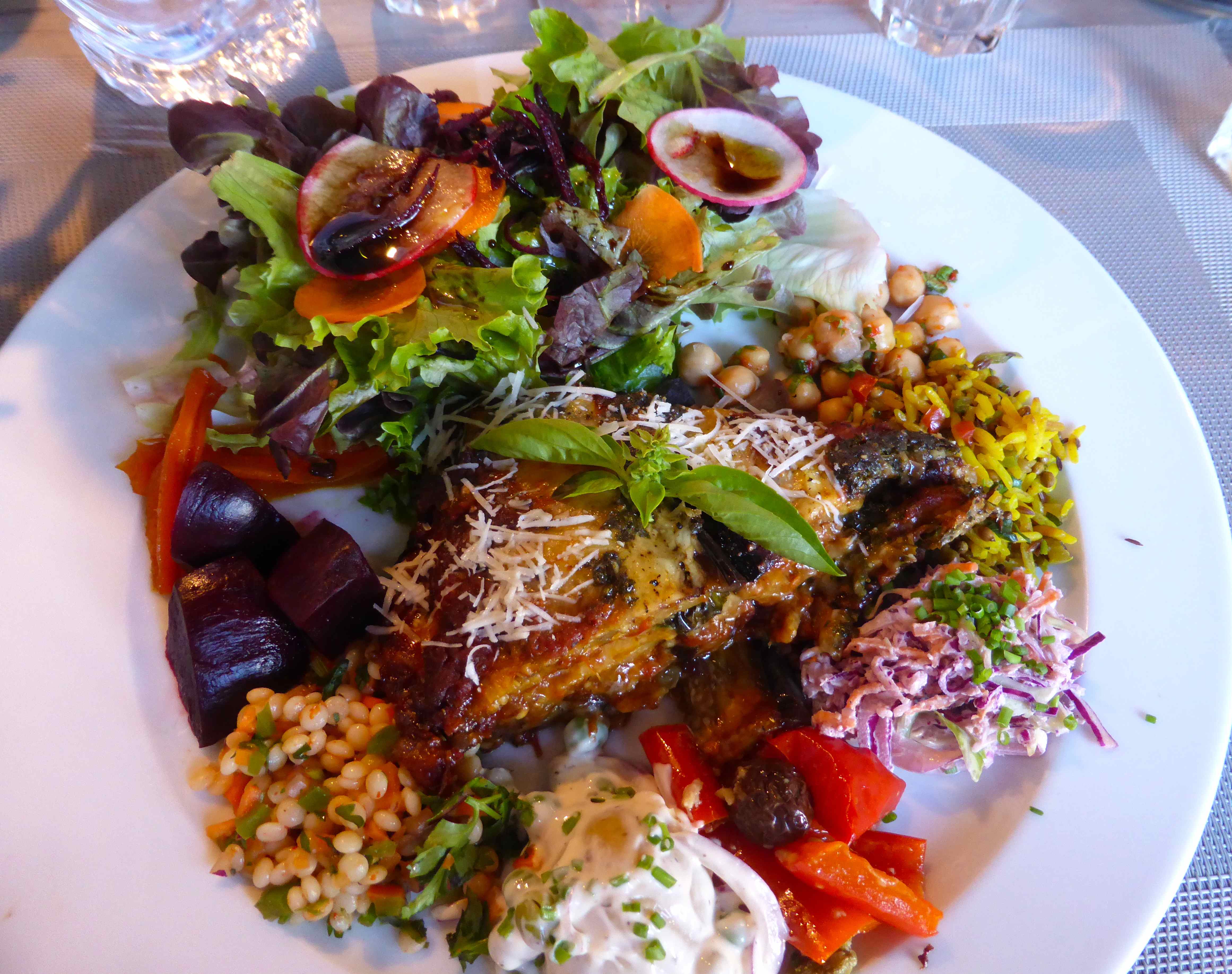 The food was SPECTACULAR. This is the best food I have had for a long time. The setting in Monchique was the best setting with excellent food but this food in Chicco’s in Praia da Luz was superb. Shame they don’t serve this food at Monchique – if they did I may have to move here. This was aubergine parmigiana with many different salads which is exactly how I like to eat with lots of little bits of a wide variety of foods.