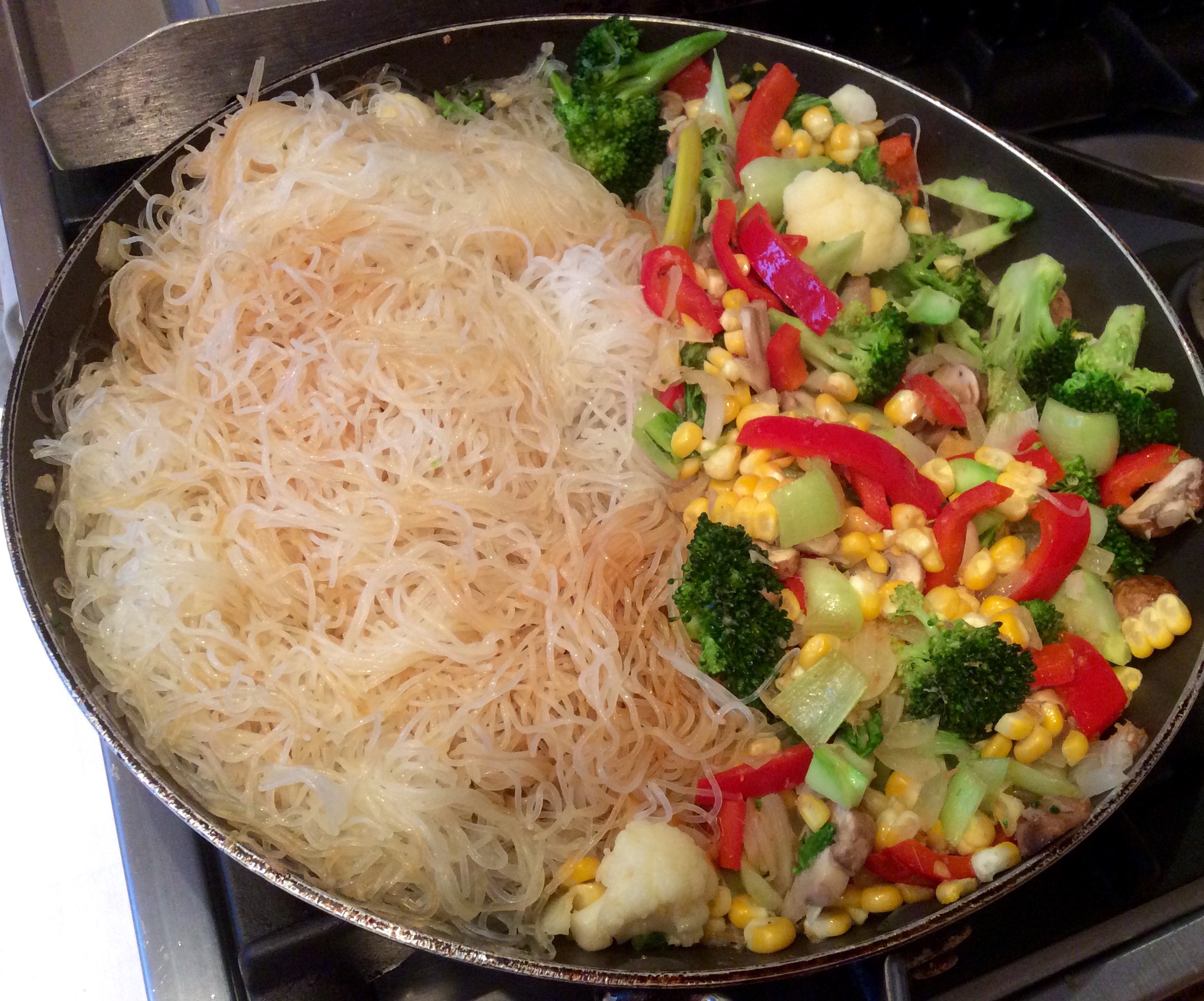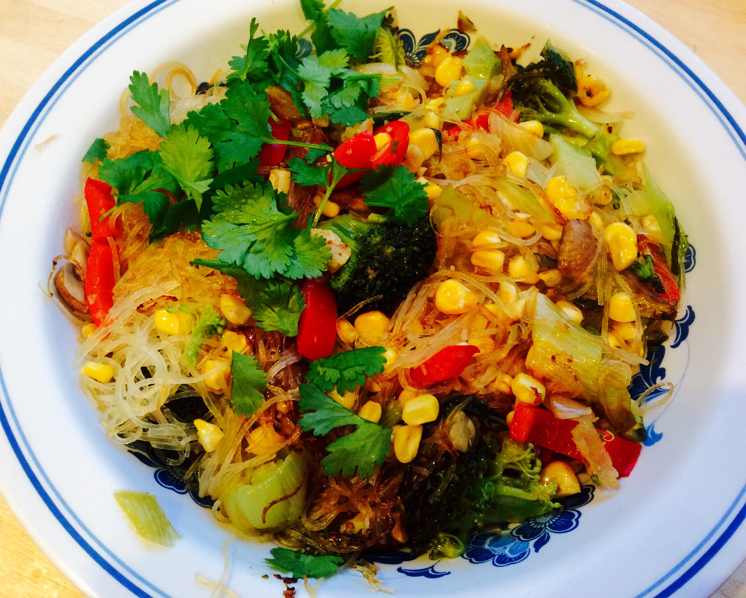 Transformed in to a stir fry with Thai flavours.  I added some mung bean noodles which were a strange texture when uncooked but lovely when boiled and then stir fried.