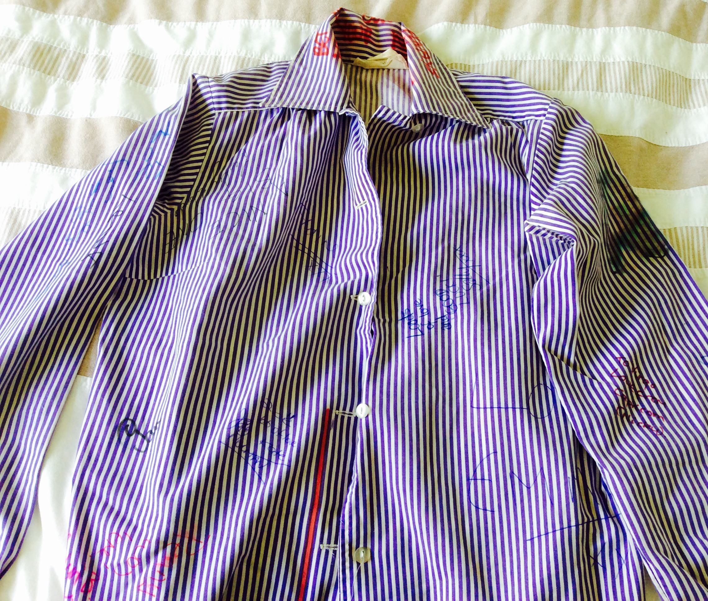 I tidied my entire room, the bathroom and the linen cupboard except for my trunk. The trunk is full of keepsakes and I wasn’t up to doing that today. I did pull out any clothing though and threw it all away apart from some baby things and this old school shirt of mine. But out when the souvenir t-shirts from inter railing and backpacking trips and from University. All gone.
