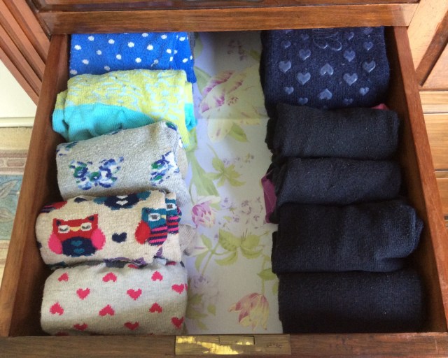 The hanging things up bit was easy. I then had to get to grips with the folding so everything you keep in a drawer stacks vertically rather than being layered on top of each other. I had to look up some videos to understand properly – there are loads on YouTube. I was glad I persevered because I LOVE it ❤️❤️❤️❤️❤️. I am now on a mission to vertically fold everything possible because it makes it so much easier to find things. Check out my super tidy sock drawer. I even finally got round to using the scented drawer liners I have had for years as I was in a use it or lose it mentality.