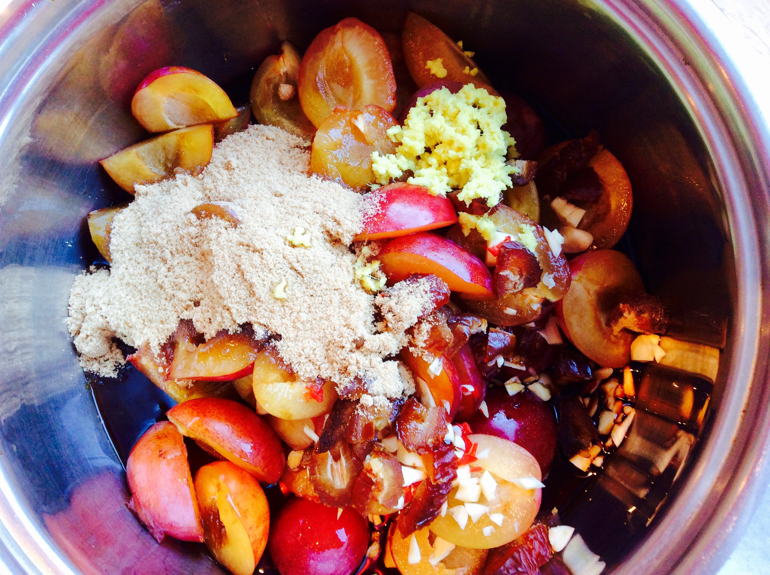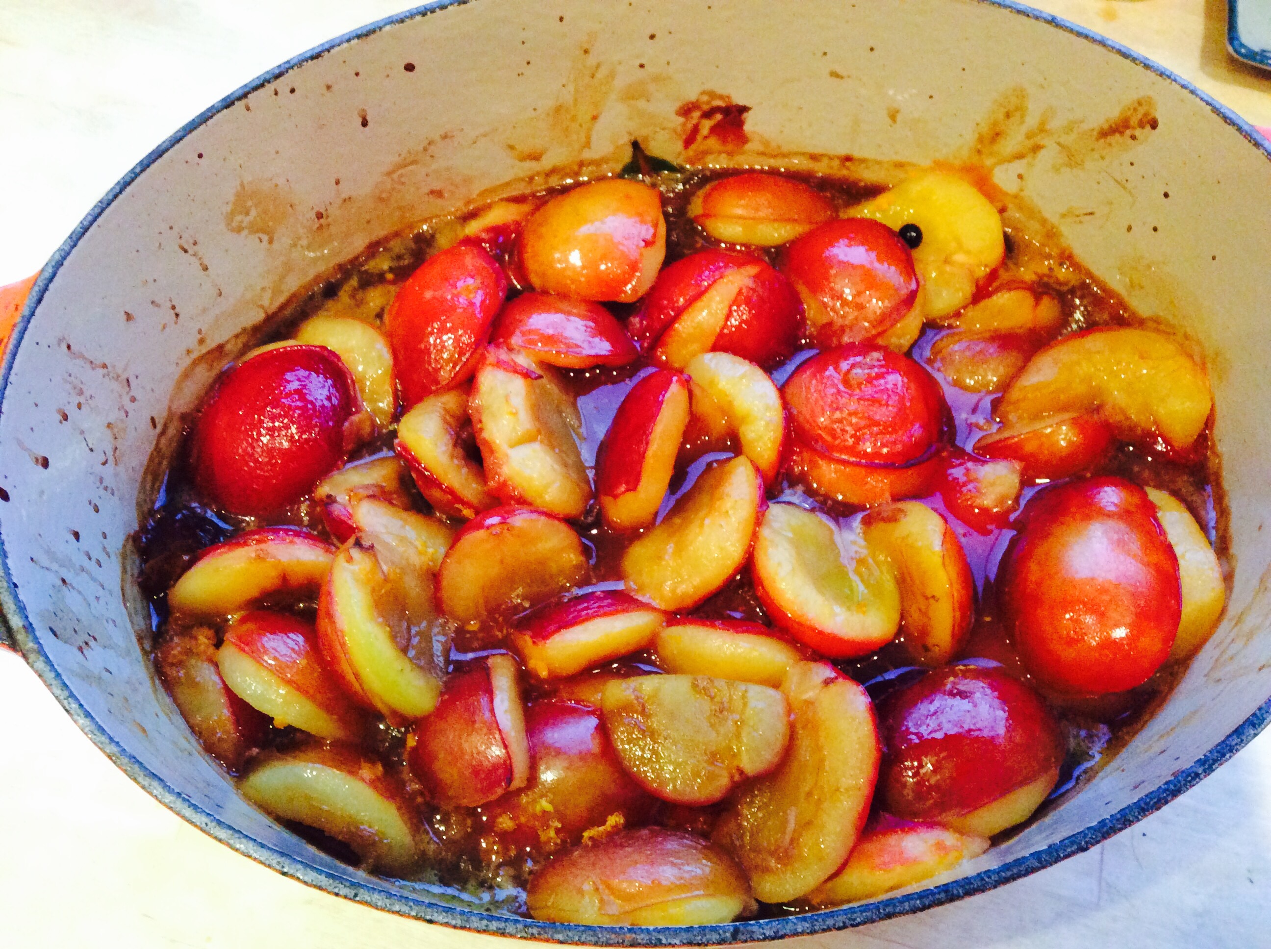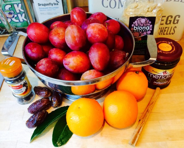 For 2 kg plums I used 3 oranges, no lemon, 3 bay leaves, 1large cinnamon stick, about 10 juniper berries, 100 g Rapadura, whole cane sugar, 1 heaped tbsp molasses and 4 large dates.