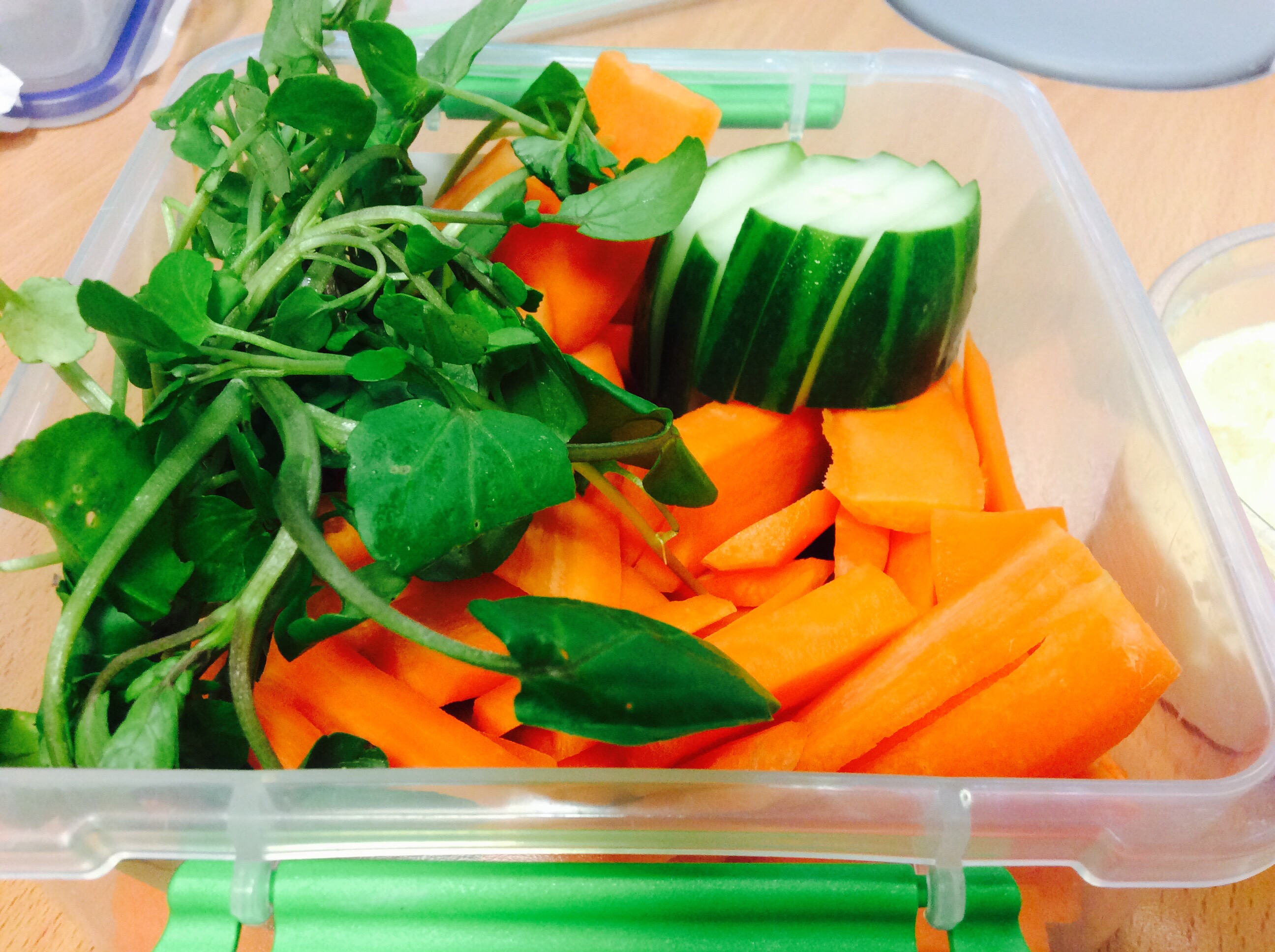 A very simple lunch; carrots, cucumber and watercress with half a tub of humous.
