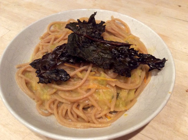 For supper tonight I roasted lots of my tomatoes, with a peeled green pepper, garlic cloves, olive oil, salt and pepper. When it was roasted (about half an hour at 170 C) I blitzed it in the Vita Mix and stirred it in to some wholemeal pasta. Served with kale crisps. I rubbed oil and some salt in to some Cavolo Nero and popped them in the oven for 15-20 minutes. A simple but delicious dinner.