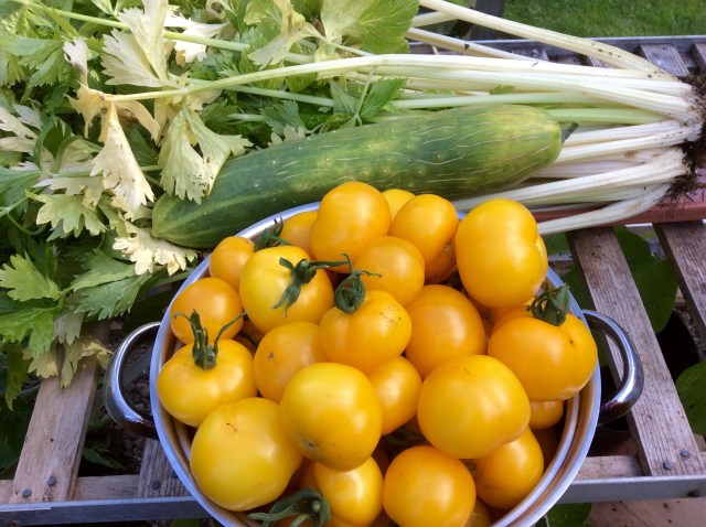 Produce from the garden: celery, tomatoes and a very large cucumber which is probably just useful for juicing.