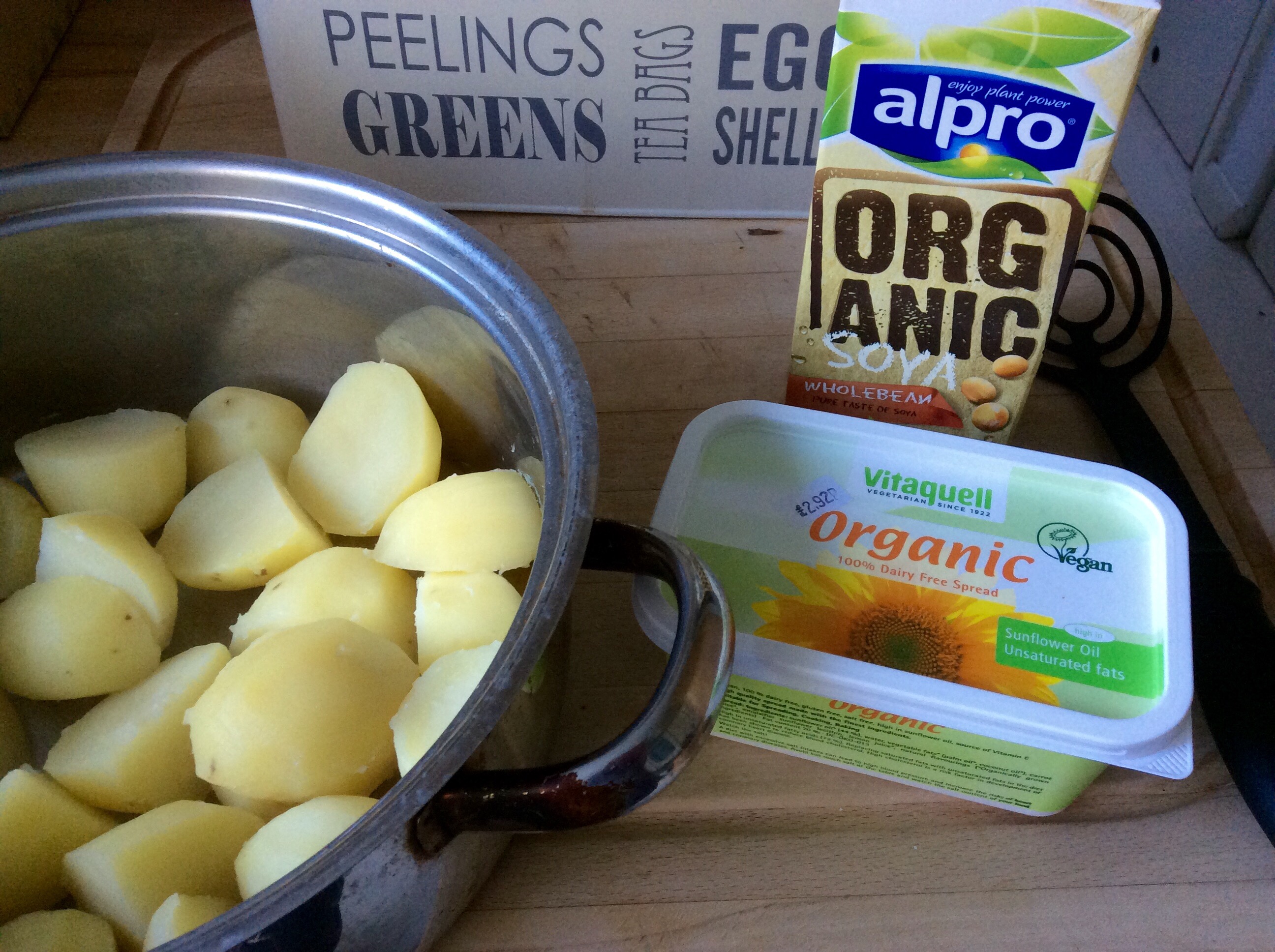 Potatoes mashed simply with vegan spread, soya milk and salt and pepper. I do concede that spread is not a patch on butter for taste but I needed something g for mashing and I tried this spread. It’s ok, just, so I am hoping there is a better tasting one out there.