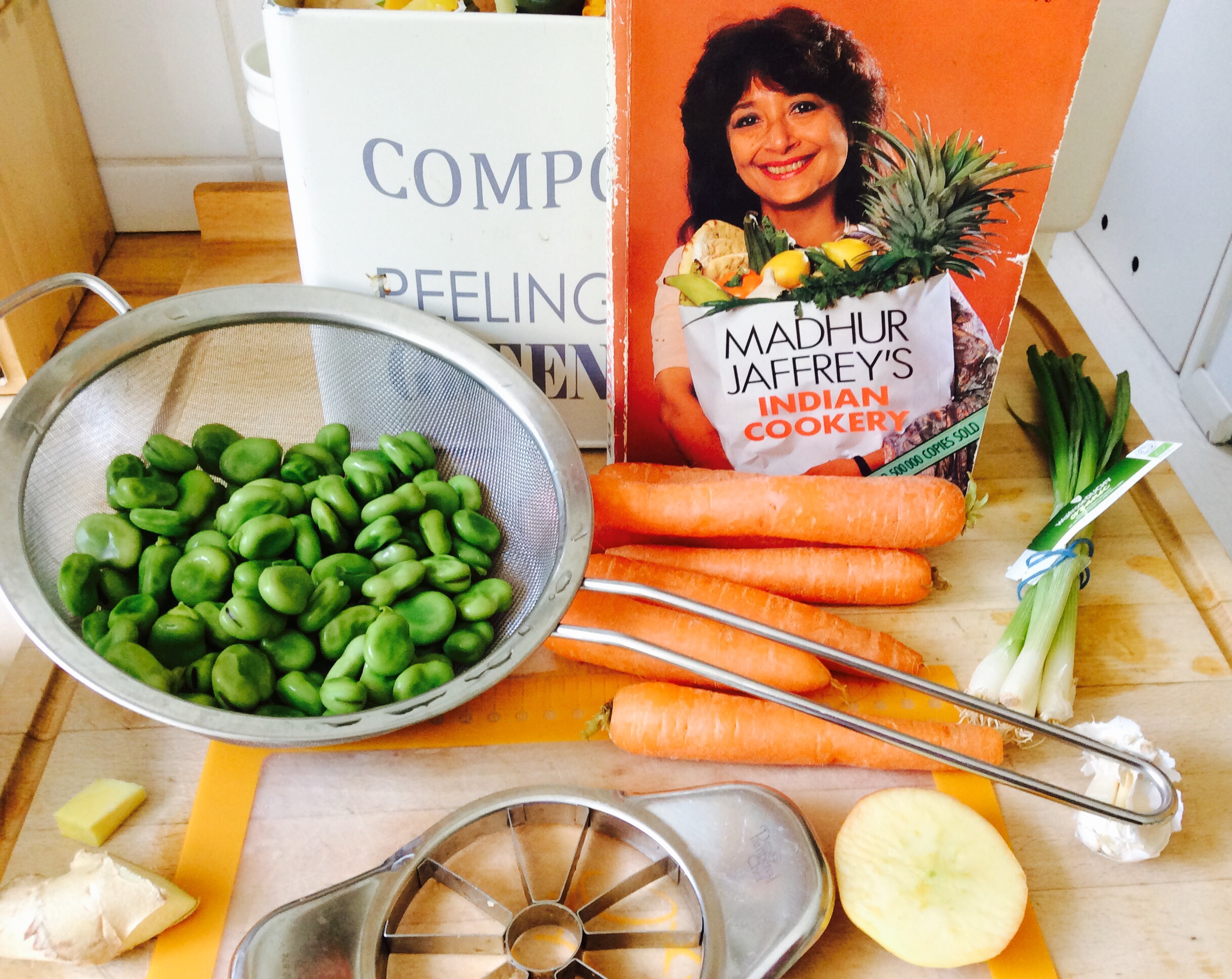 Indian food is a wonderful source of meal ideas for vegans and vegetarians. One of my favourite recipe books is Madhur Jaffies’ ‘Indian Cookery.’ It contains chapters on recipes for vegetables and pulses. So I contendely chopped up veggies and munched on an apple as I went.