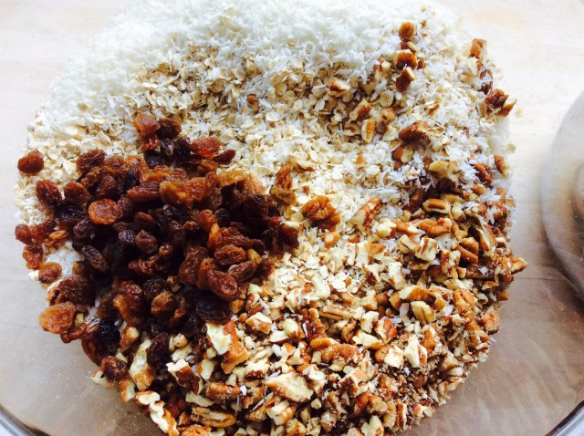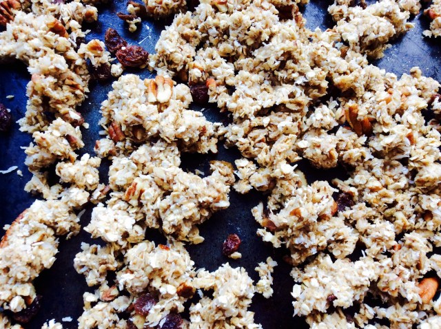 While the curries were cooking I made a batch of granola, which is really easy. I loosely followed the recipe in ‘ The China Study Cookbook’. You put the dry ingredients in one large bowl : 4 and 1/2 cups of oats, 1 cup chopped nuts, 1 cup desiccated coconut and 1 cup of raisins. You put the wet ingredients in a saucepan: 1 cup water, 1/2 cup brown sugar, 1/3 cup maple syrup, 2 tsp vanilla extract, 1/2 tsp cinnamon and 1/4 tsp nutmeg. Heat the wet ingredients for 2-3 minutes until the sugar is dissolved, mix well in to the dry ingredients and then spread out in 2 baking trays. Place in a cool oven (140C) for 15 minutes, stir and cook for another 15 minutes, repeat once more then stir and leave in the oven but turn to oven off.