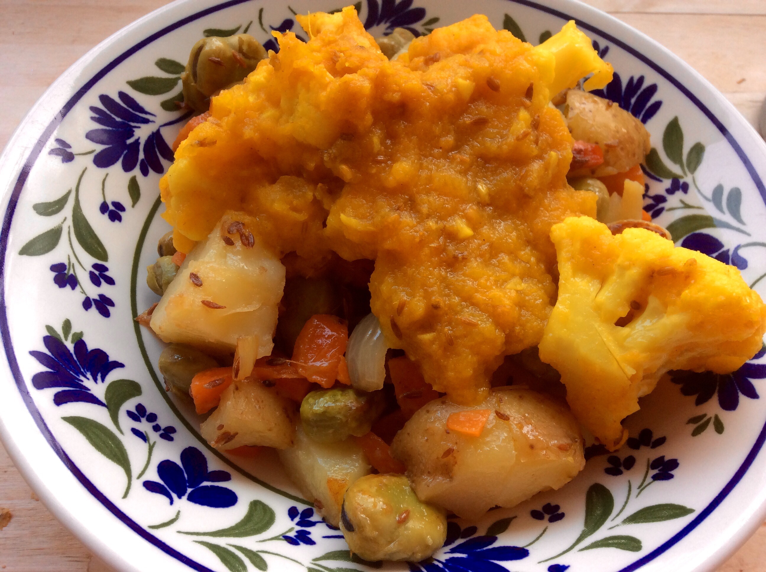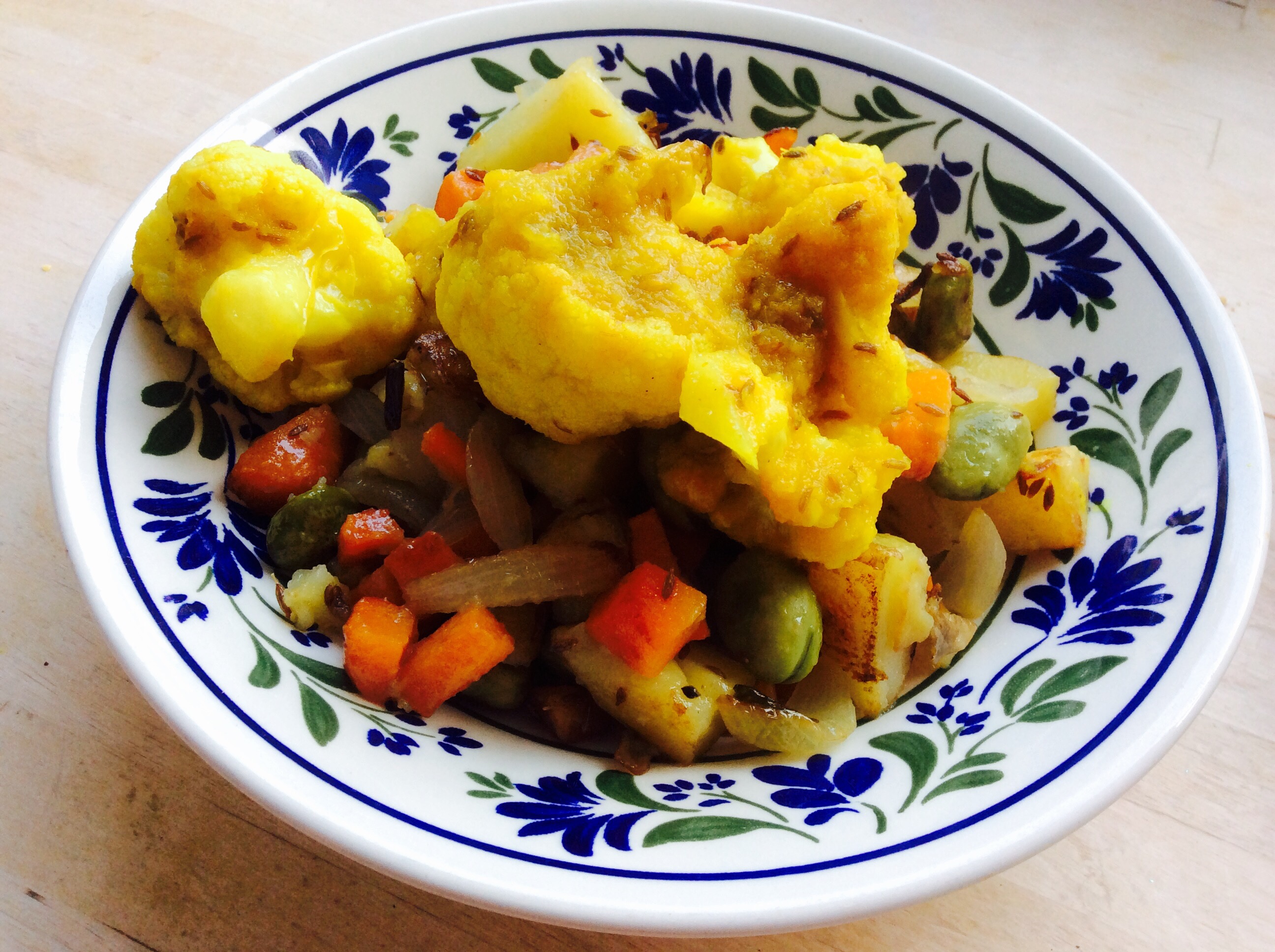 For lunch we had 2 curries; cauliflower with onion and tomato and carrots, peas and potatoes, flavoured with cumin. I used yellow tomatoes, hence the final dish was very yellow!