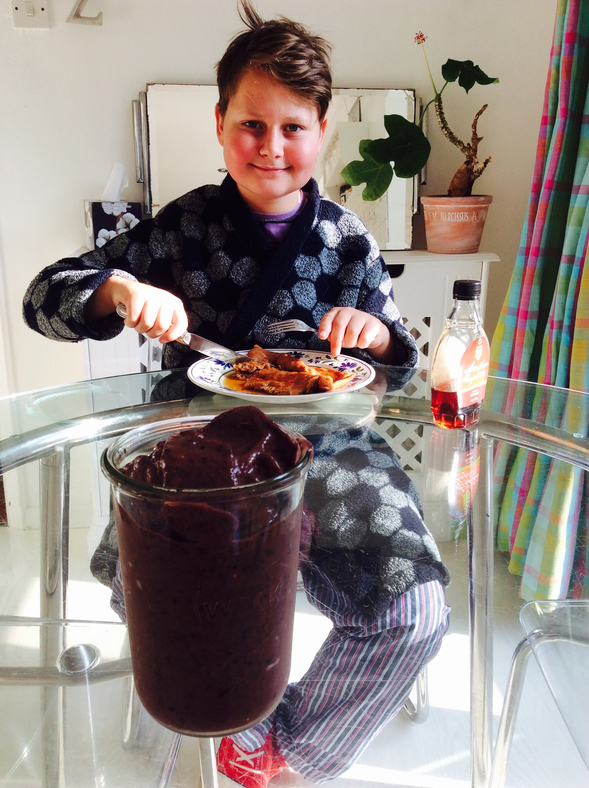 I made myself a smoothie with 3 frozen bananas and lots of frozen berries with some Cavolo Nero and sea greens and I made Harvey a pancake using a vegan recipe from’ The Happy Herbivore’.