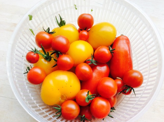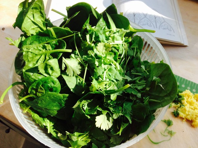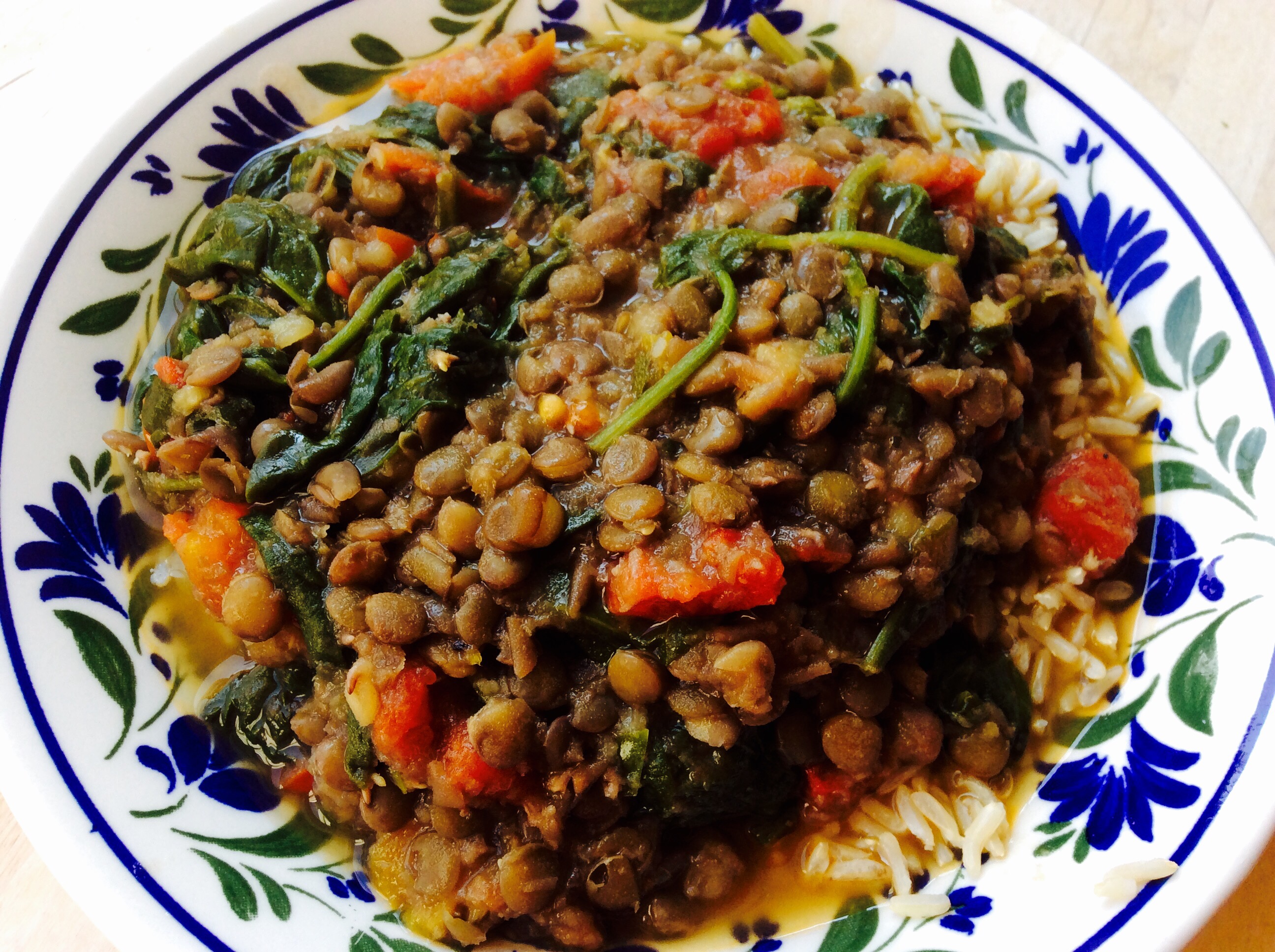 For lunch I made a Madha Jaffrey recipe with lentils, spinach and lots of ginger.  I also added some tomatoes from the garden.  My tomato crop just keeps on giving this year.