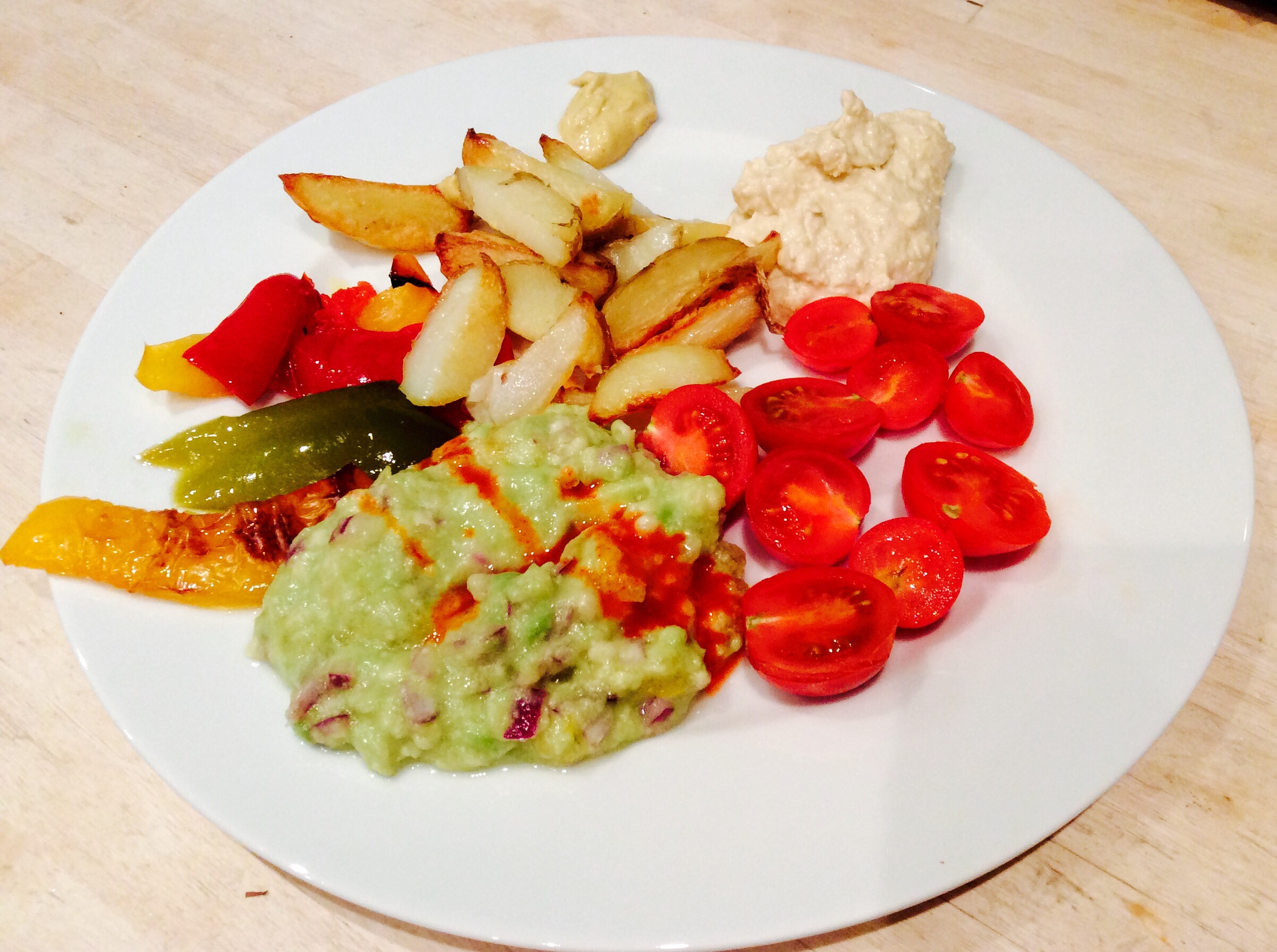 A simple supper of roasted peppers and potatoes, humous, a salsa made with avocado, sweet corn, red onion, yellow tomato and green chilli and later some bread sticks to use up the humous and salsa.  Yummy.