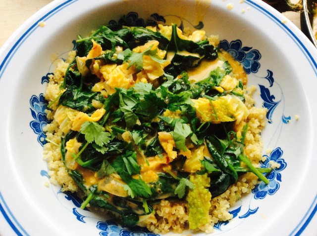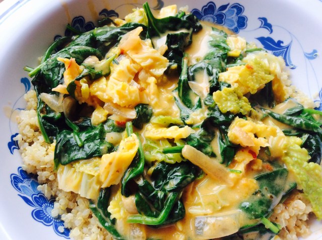 The cabbage and spinach in red Thai curry sauce was surprisingly tasty and I was only using up leftovers. For the vegans amongst you, you have to track down a red Thai curry paste which does not contain shrimp or crustaceans of any kind which most brands do but it is possible.