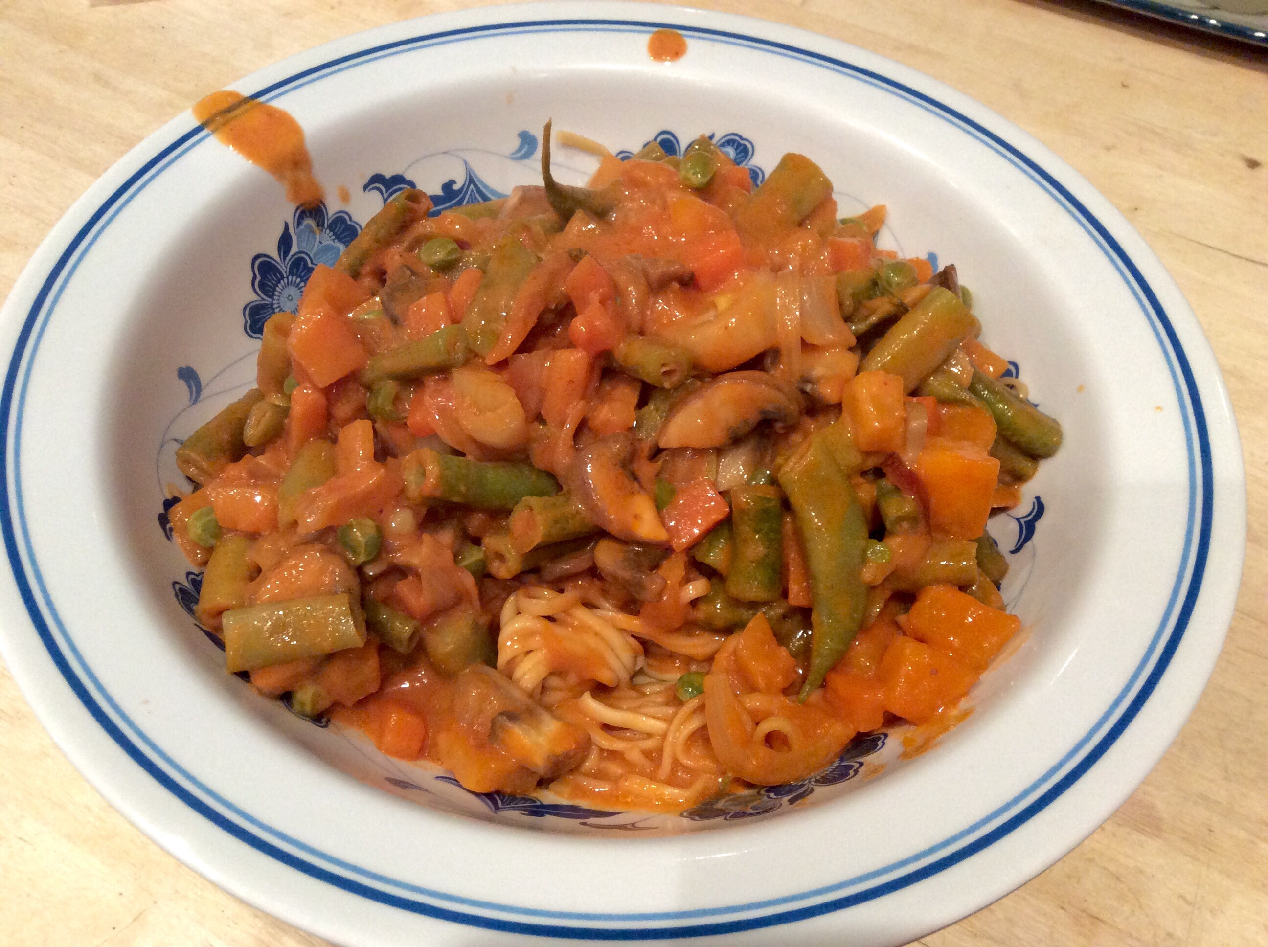 Supper was a Thai vegetable curry I made using lots of veggies, including peas and beans from the garden (via the freezer). Served on a bed of noodles.