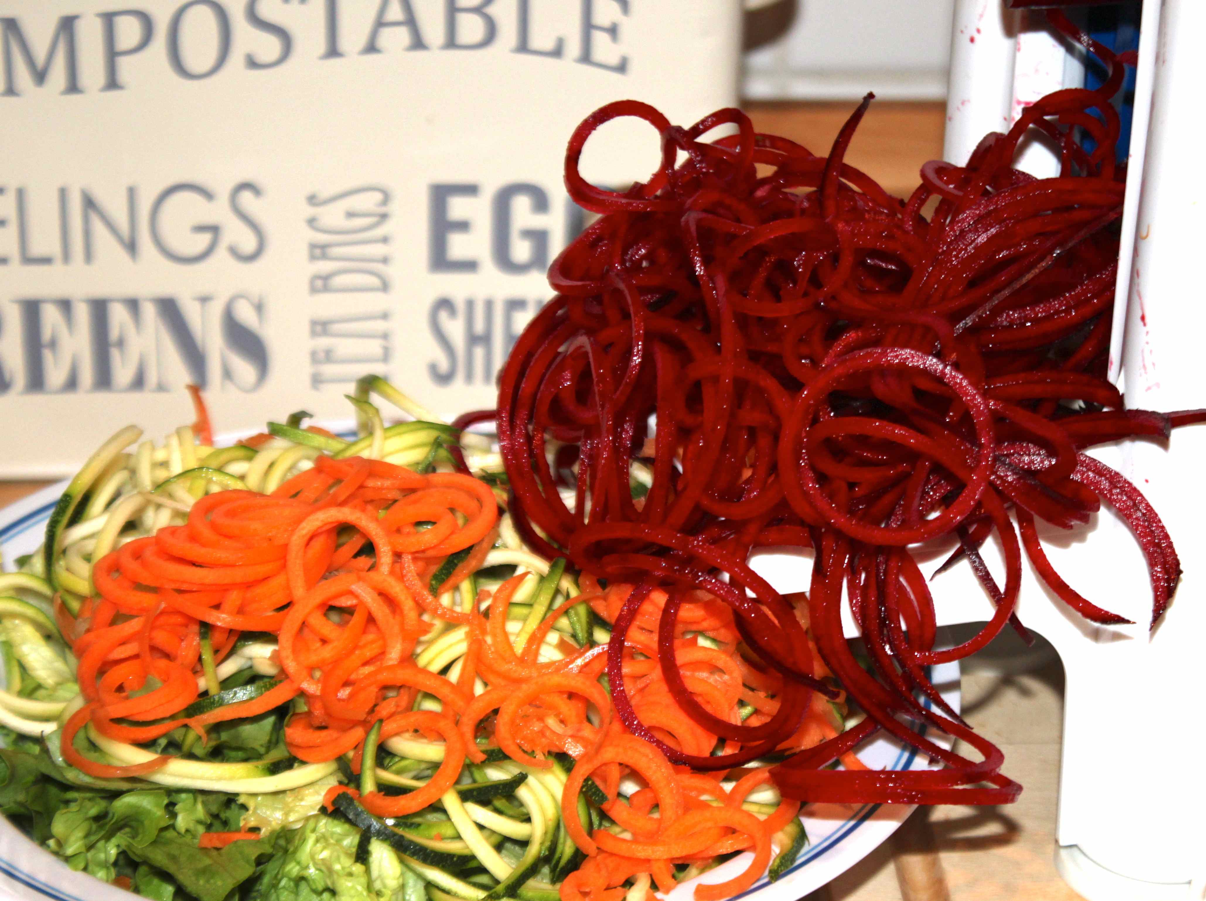A simple salad made with spinach leaves, shredded carrot and cherry tomatoes, with a ‘dressing’ made with a blended pear and celery.