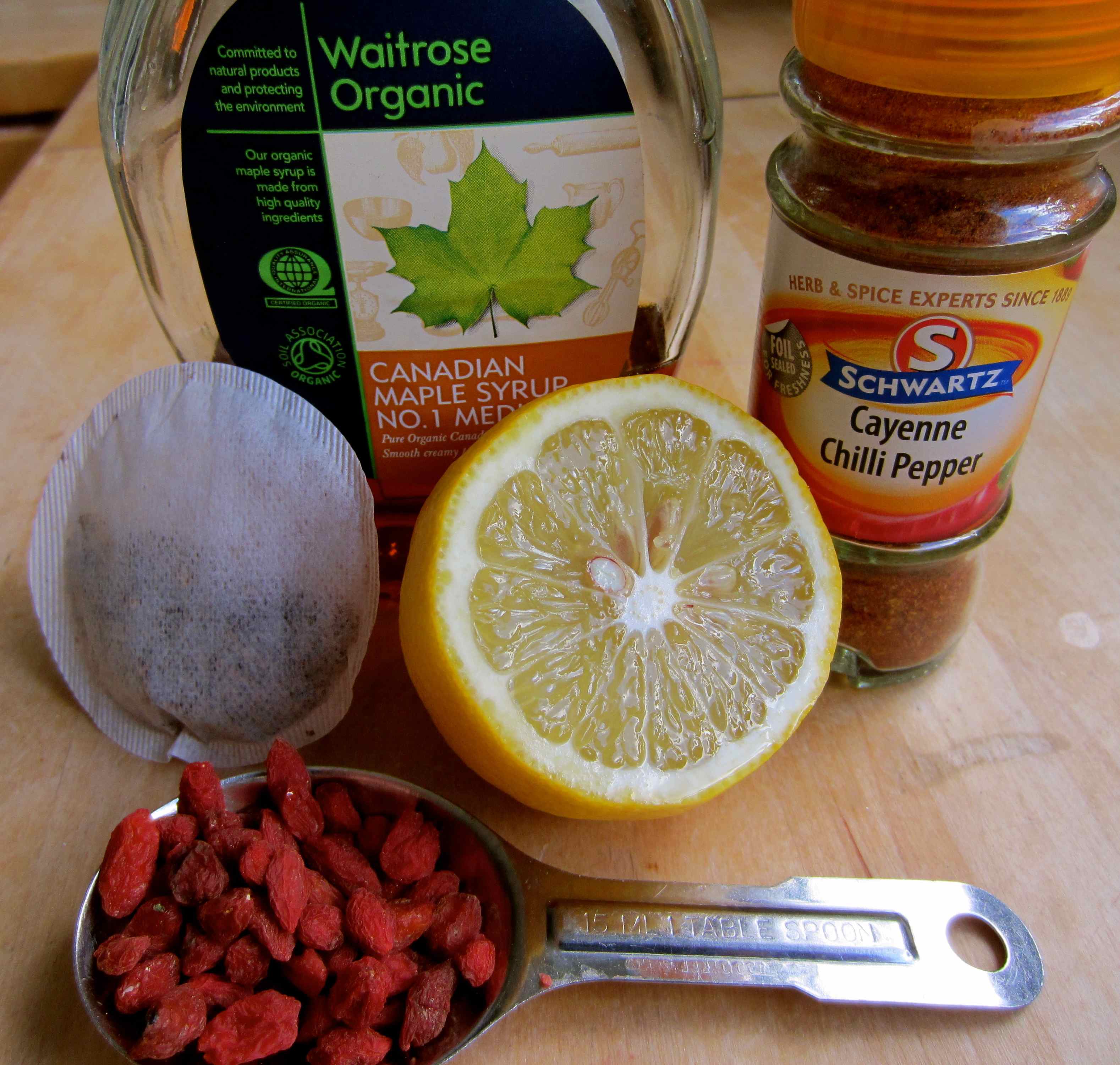 First thing I had a mug of tea with lemon juice, cayenne, Goji berries (1 point) and maple syrup (1 point).